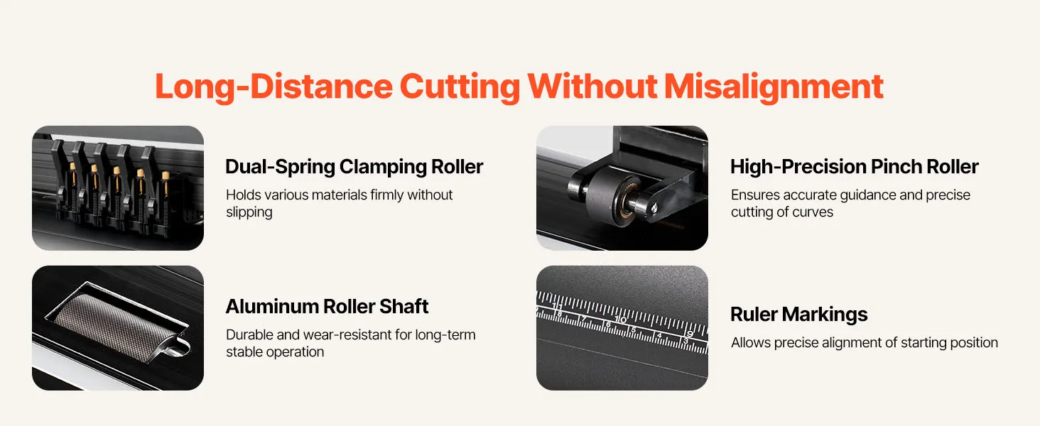• Precise Cutting: Intelligent contour detection with ±0.1 mm accuracy and dual-spring pinch rollers keep media steady. Even during long cuts, the vinyl printer and cutter delivers exact tracking, clean edges, and flawless detail handling