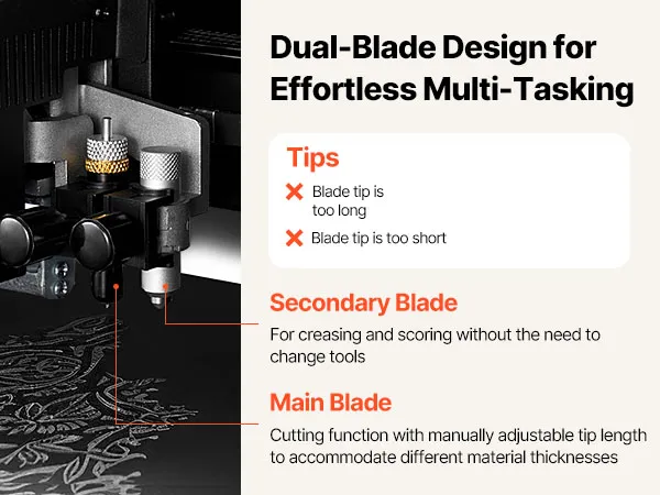 • Dual-Blade Design: Our vinyl plotter cutter is equipped with main and auxiliary blades for simultaneous drawing + cutting or scoring. No manual blade swaps needed. One setup completes multiple operations, greatly improving efficiency