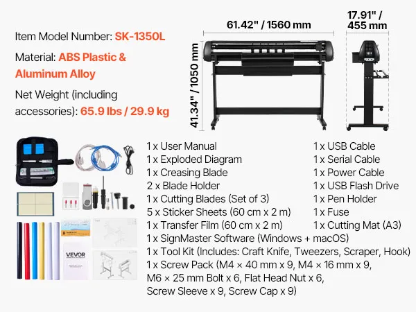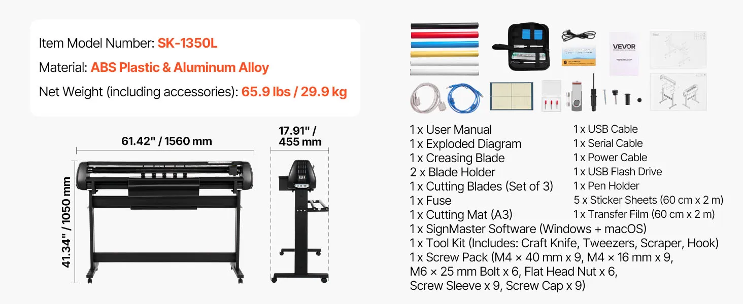 VEVOR Vinyl Cutter Machine, 1350 mm Max Feed Width, Dual Blades, Adjustable Force and Speed, LED Display, Vinyl Plotter Cutter Printer Bundle with Sticker Sheets, Transfer Film, Signmaster Software