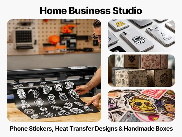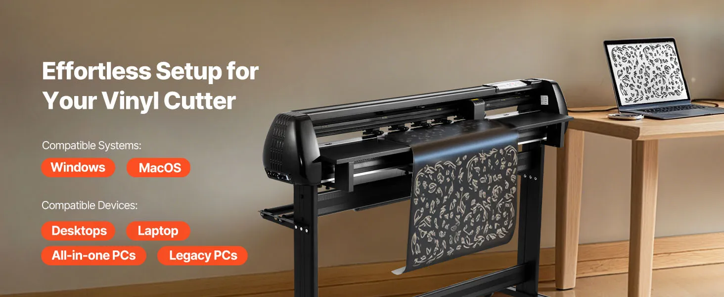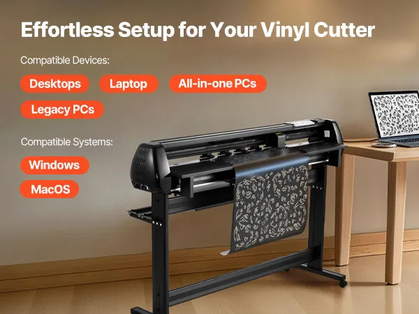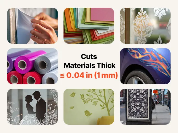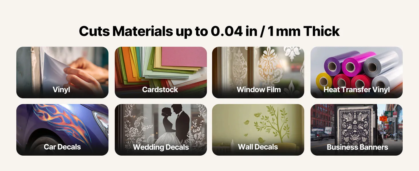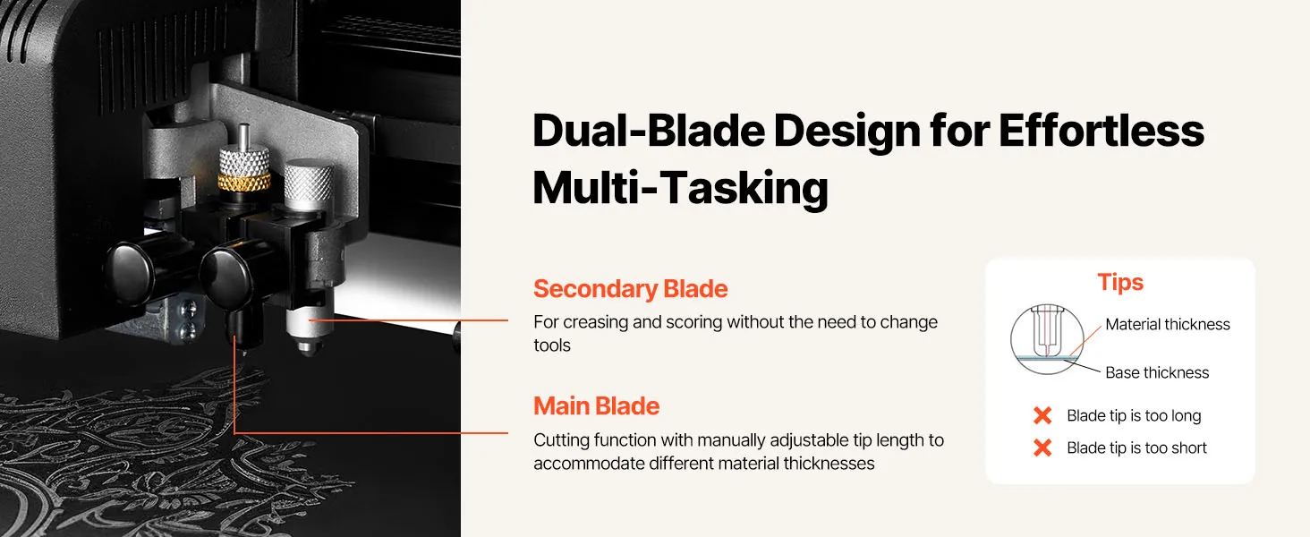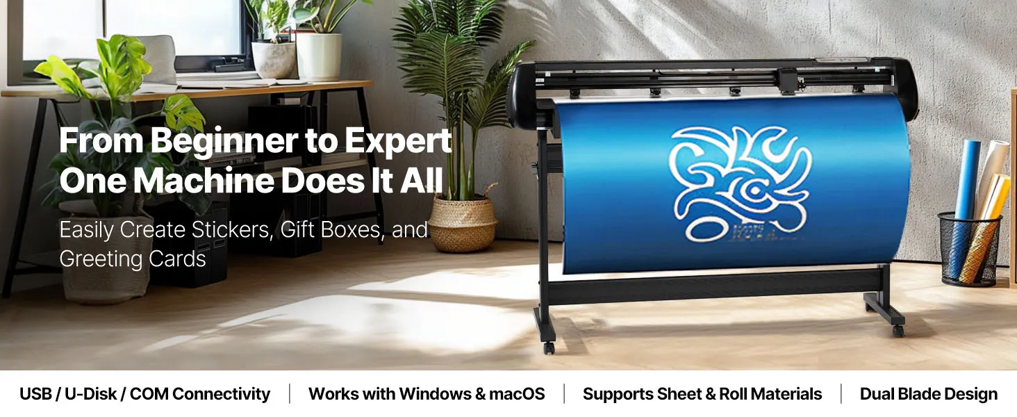 This vinyl cutter machine features a dual-blade design for plotting and cutting/scoring without blade swaps. It is compatible with Windows and Mac. Cuts sheets or rolls up to 1 mm thick with adjustable force. ±0.1 mm precision and contour detection ensure stable, detailed cuts—easy for beginners.