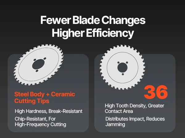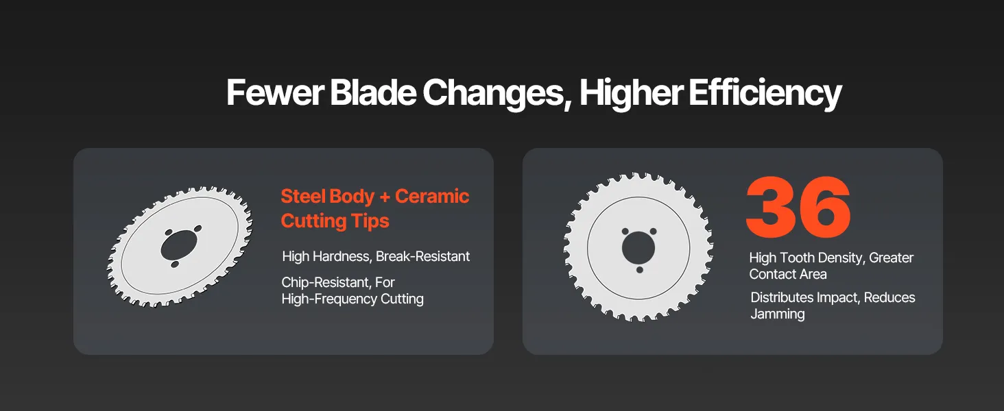 Dense teeth design cuts smoothly with less stalling, so you won’t swap blades as often. Steel body and ceramic alloy tips deliver high hardness and chip-resistance for time-saving, high-duty cutting.