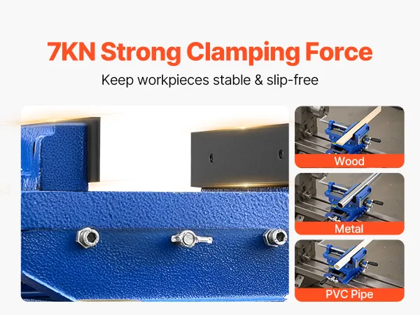 Delivers up to 7 KN of powerful clamping force, the drill press vise ensures secure fixation of wood, metal, and PVC pipes.