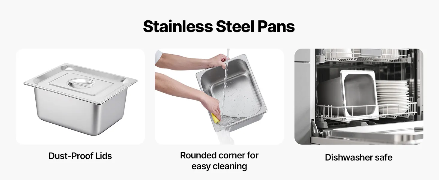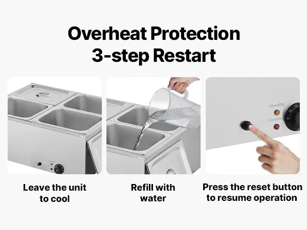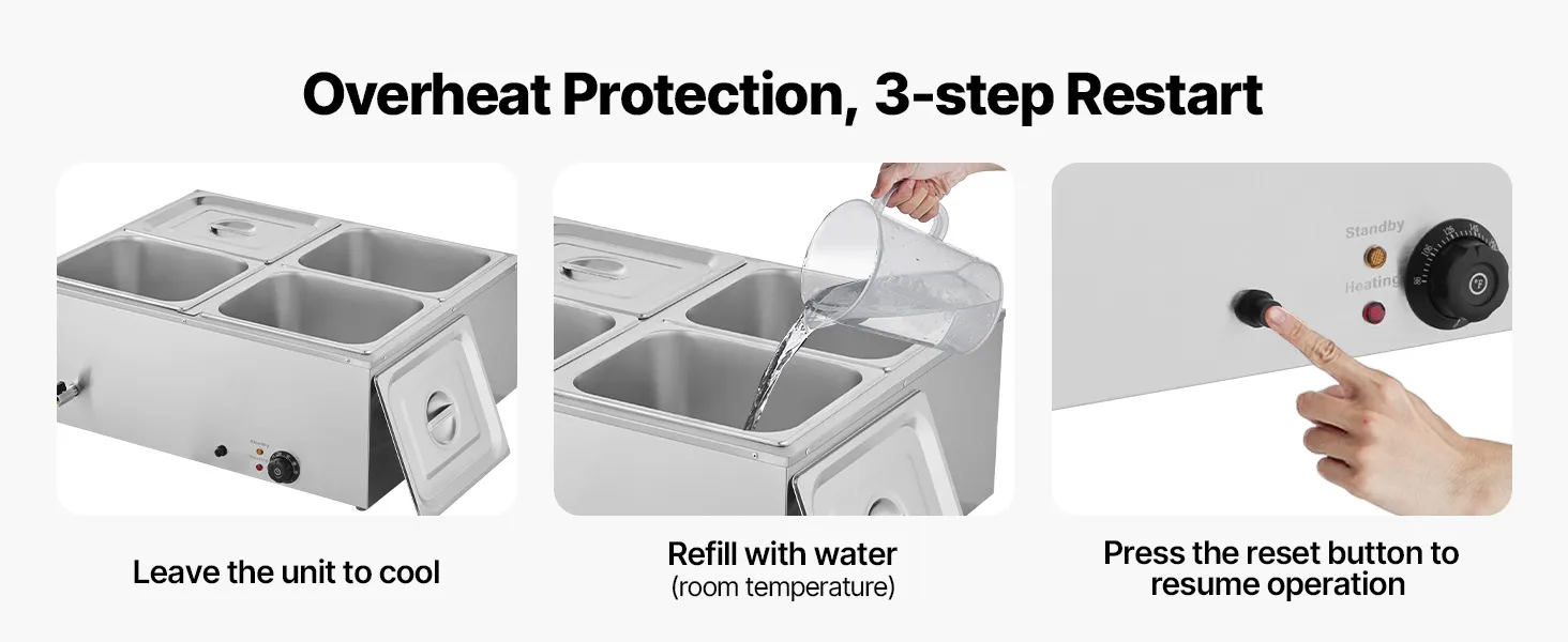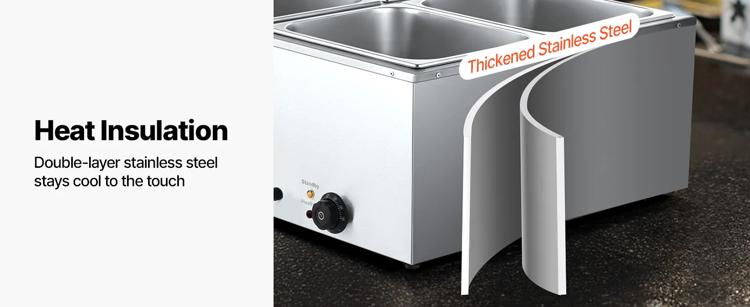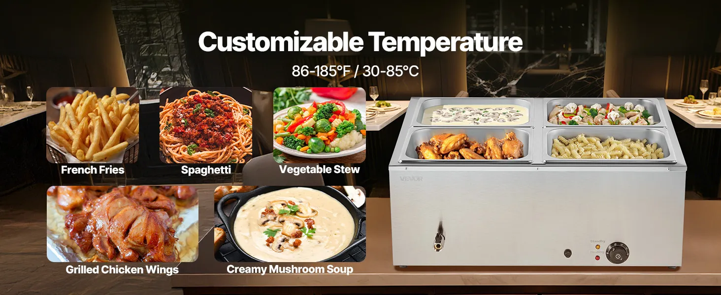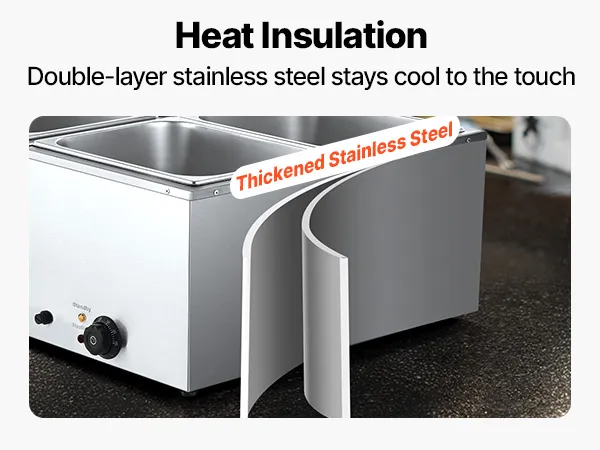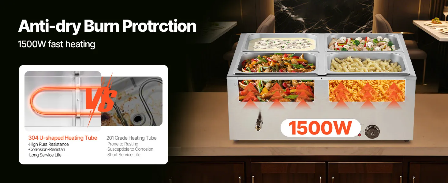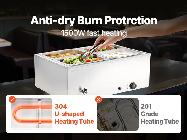 Made of stainless steel for durability and easy cleaning, this food warming features a wide U-shaped heating tube, adjustable temperature (30-85°C / 86-185°F), and a large chamber ideal for hotels, buffets, snack bars, and outdoor parties.