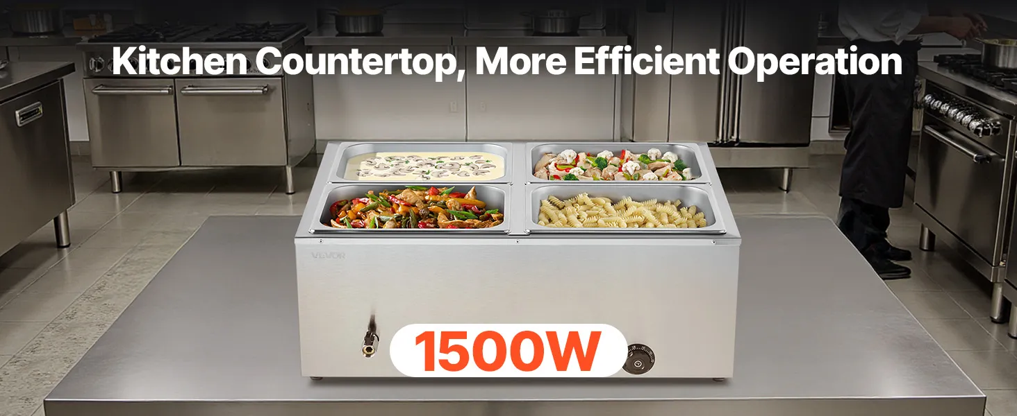 VEVOR Commercial Food Warmer, 1500W Electric Stainless Steel Steam Food Warmer with Lid, 4-Pan Fast Heating Countertop Buffet Bain Marie with Soup & Perforated Ladles, for Catering, Restaurant, Party