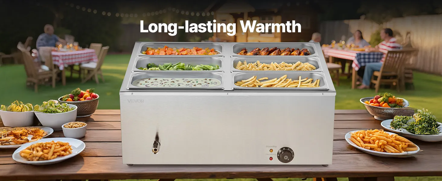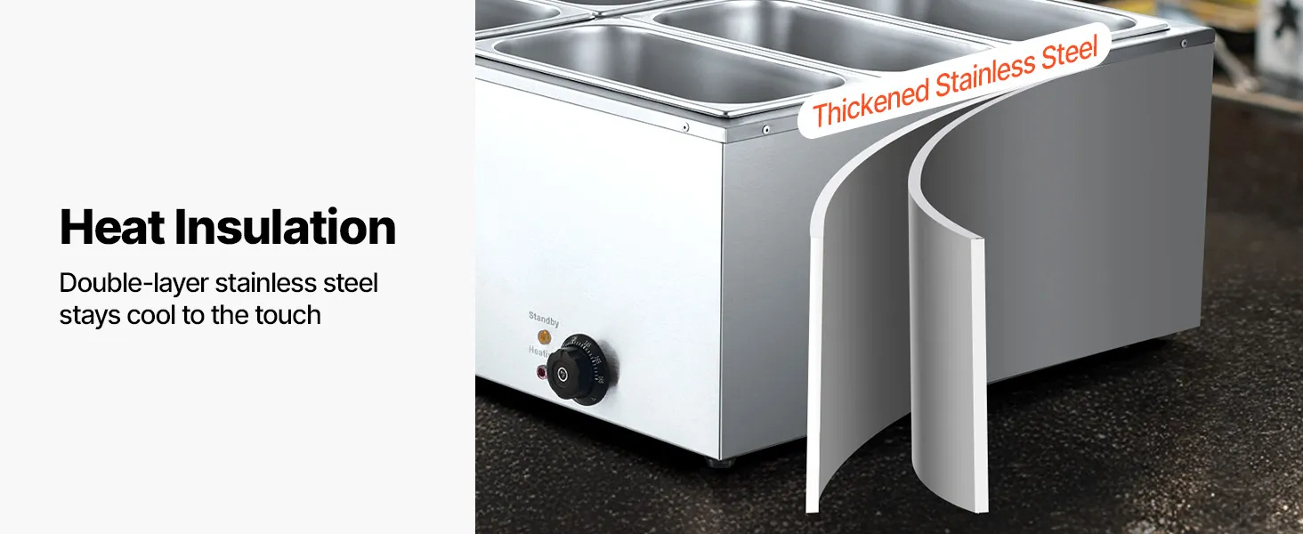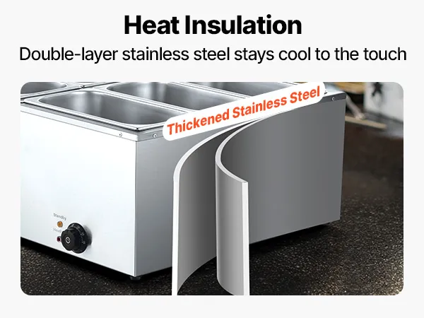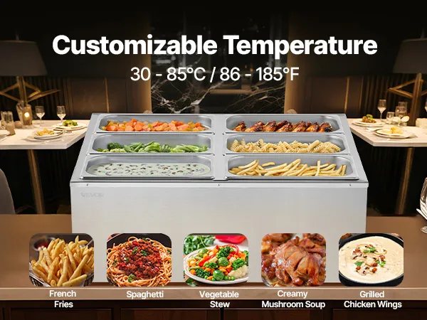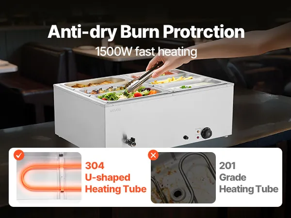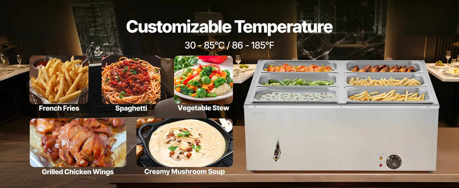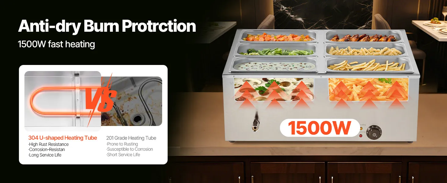Made of stainless steel for durability and easy cleaning, this food warming features a wide U-shaped heating tube, adjustable temperature (30-85°C / 86-185°F), and a large chamber ideal for hotels, buffets, snack bars, and outdoor parties.