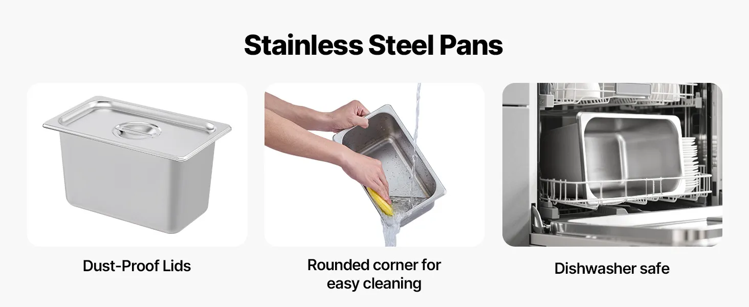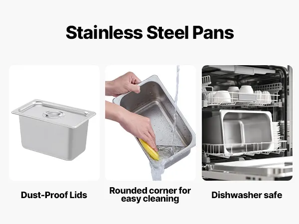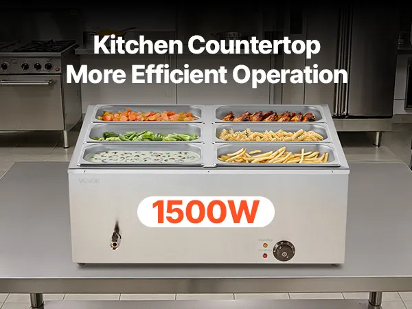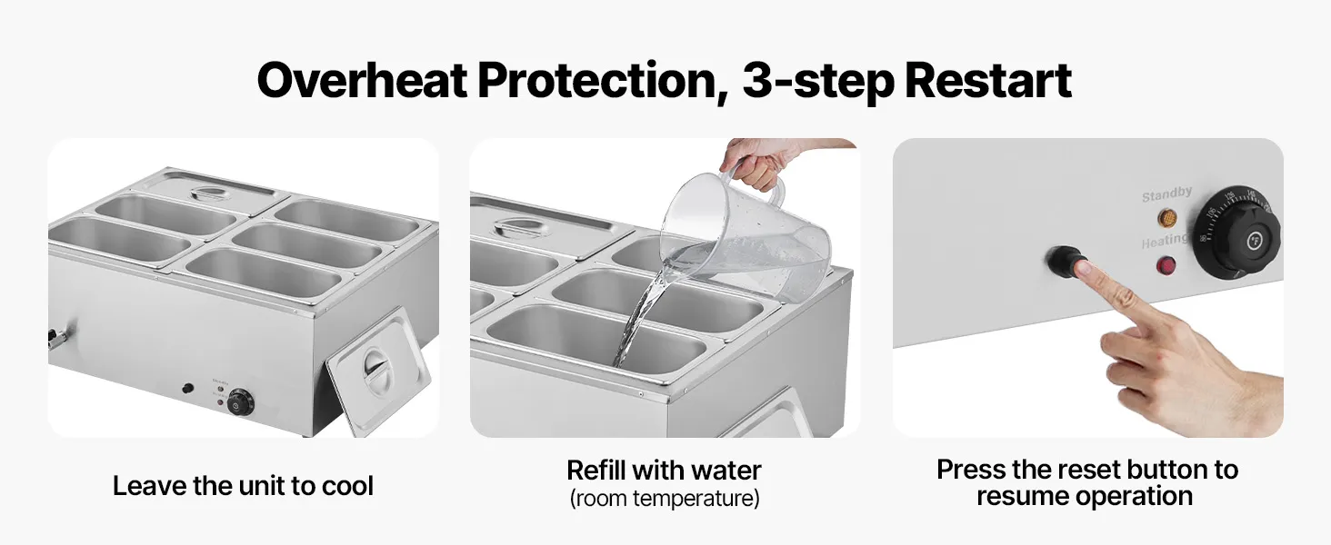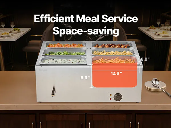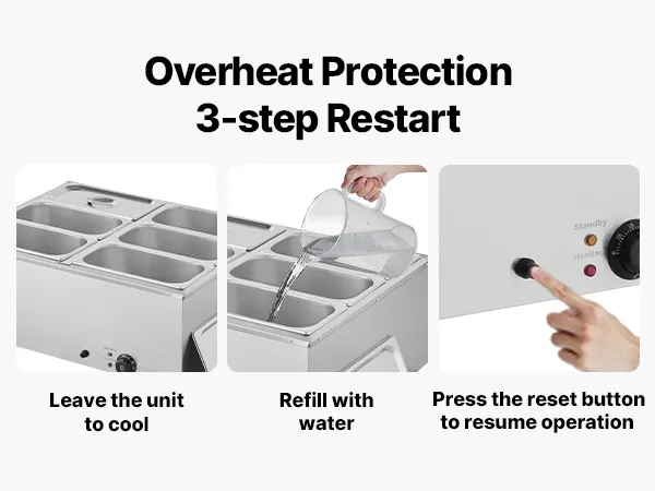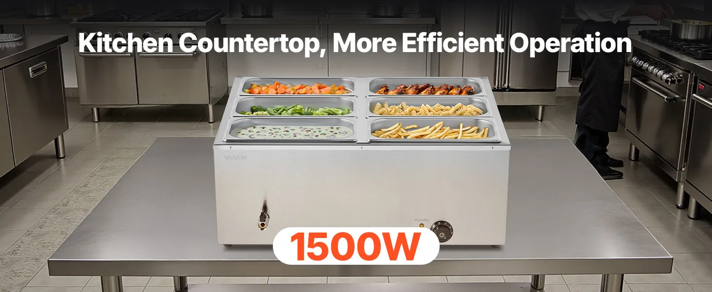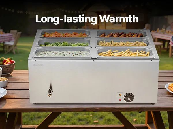 Made of stainless steel for durability and easy cleaning, this food warming features a wide U-shaped heating tube, adjustable temperature (30-85°C / 86-185°F), and a large chamber ideal for hotels, buffets, snack bars, and outdoor parties.