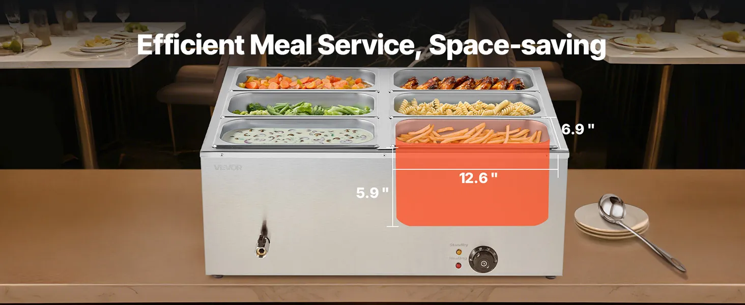 VEVOR Commercial Food Warmer, 1500W Electric Stainless Steel Steam Food Warmer with Lid, 6-Pan Fast Heating Countertop Buffet Bain Marie with Soup & Perforated Ladles, for Catering, Restaurant, Party