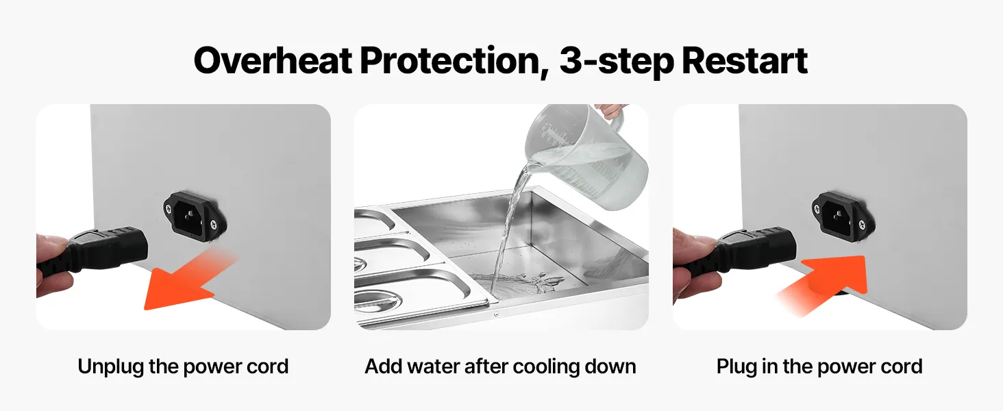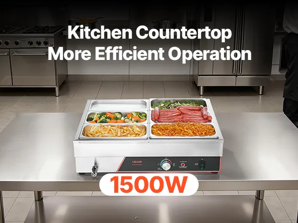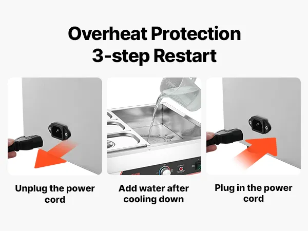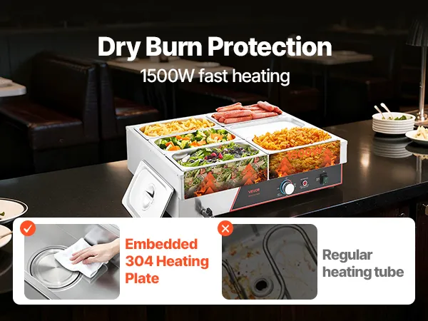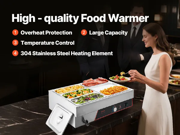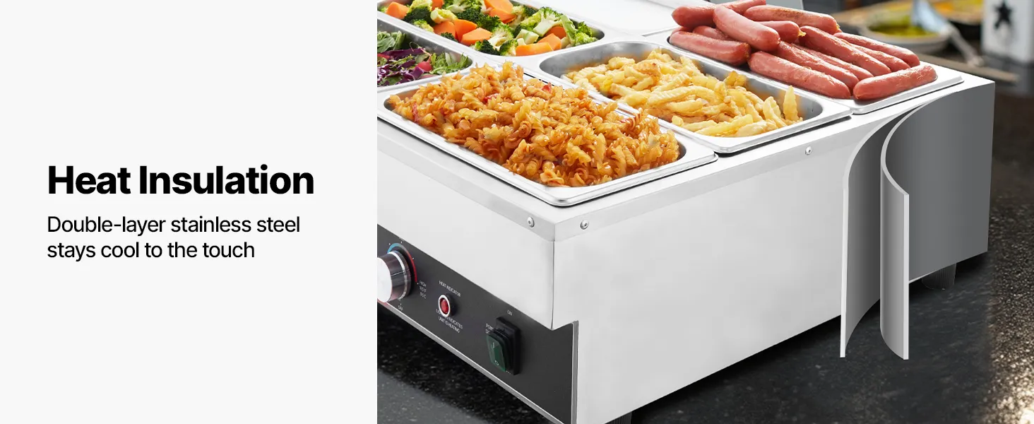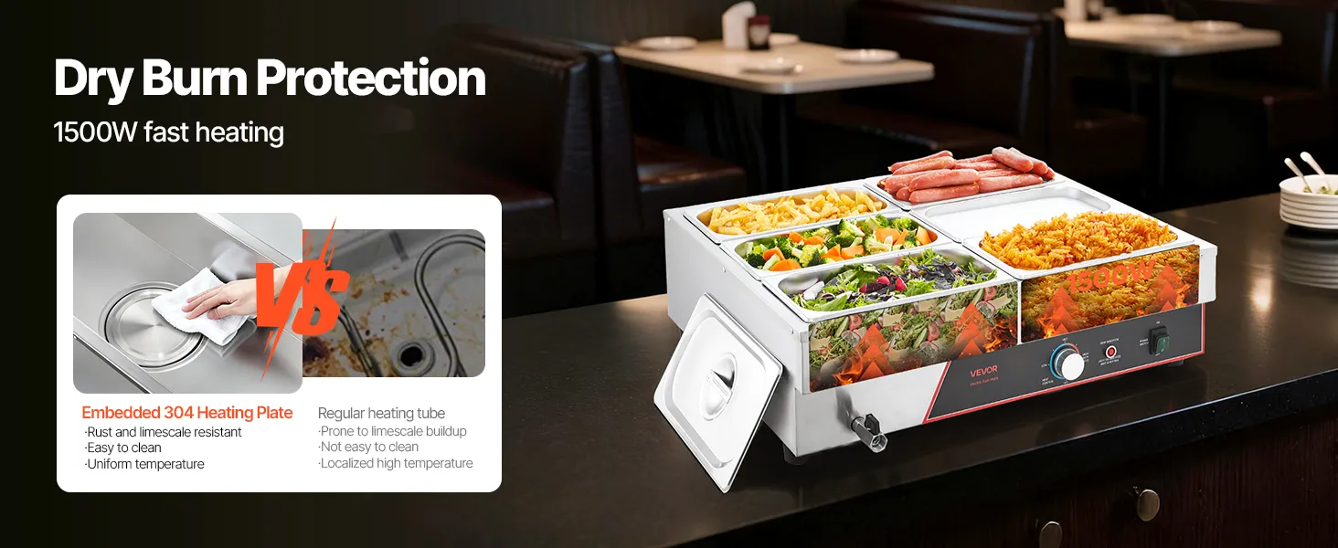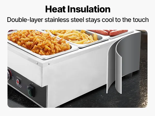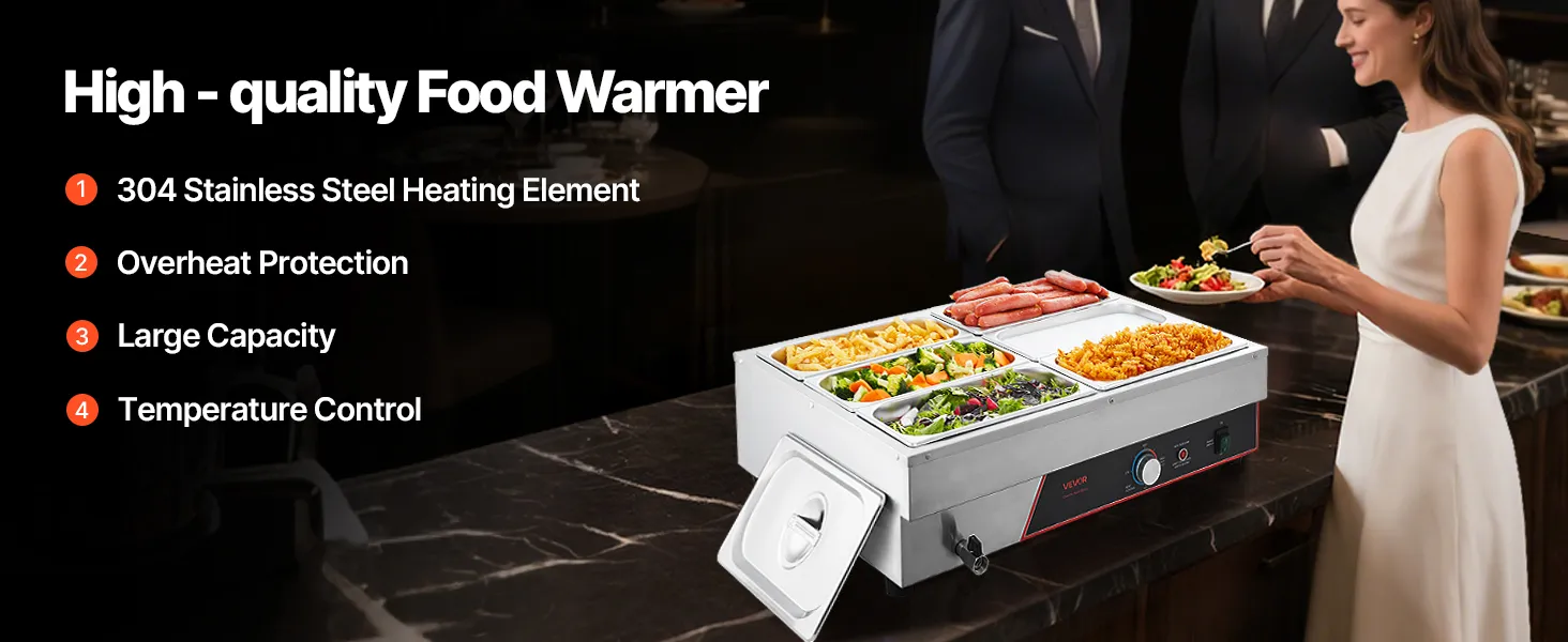 Made of stainless steel for durability and easy cleaning, this food warming features a wide U-shaped heating tube, adjustable temperature (30-85°C / 86-185°F), and a large chamber ideal for hotels, buffets, snack bars, and outdoor parties.