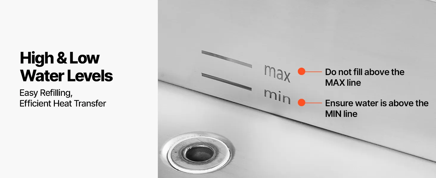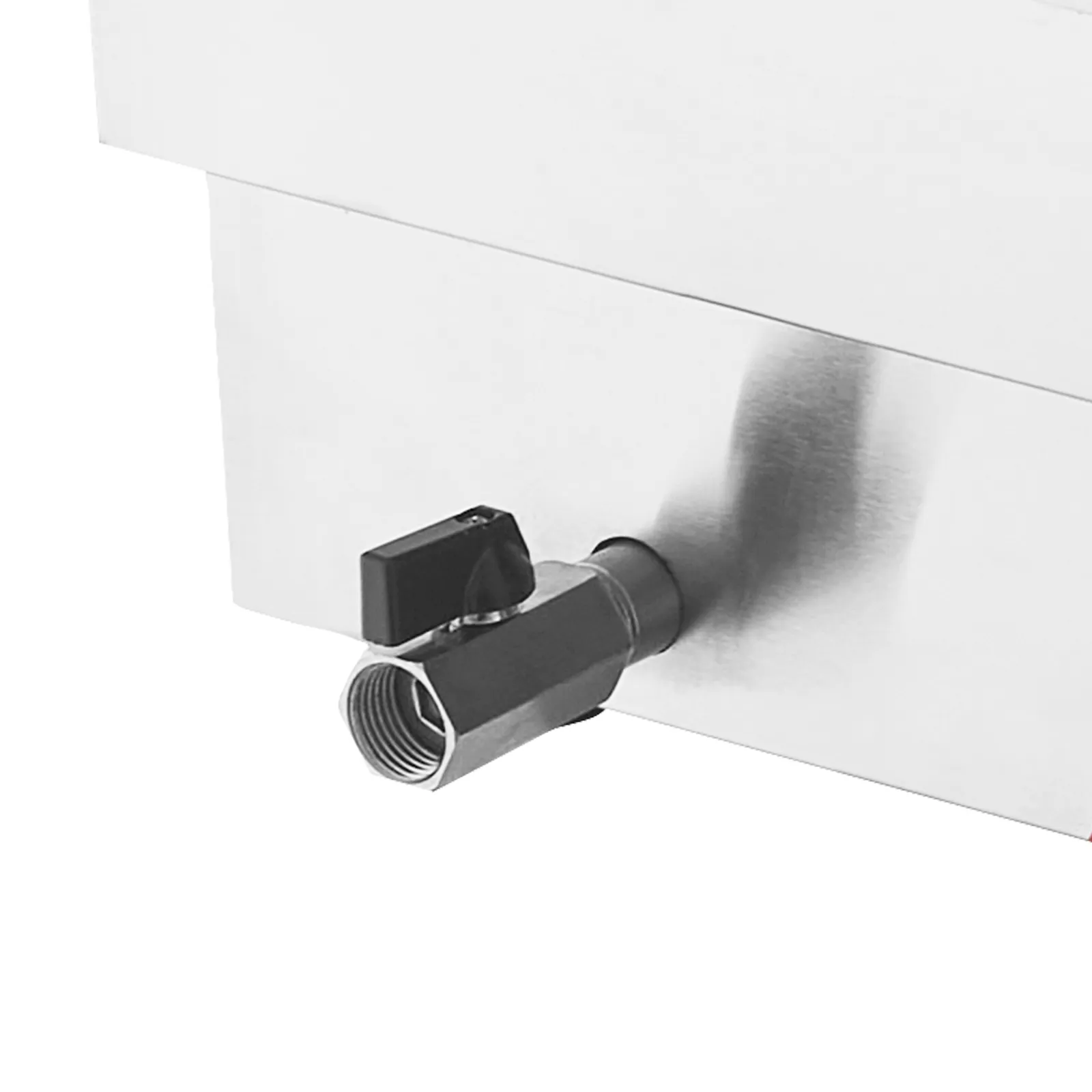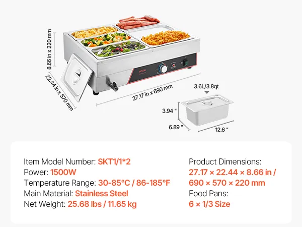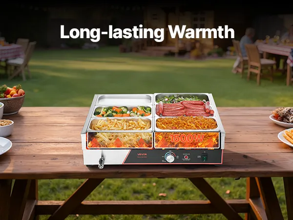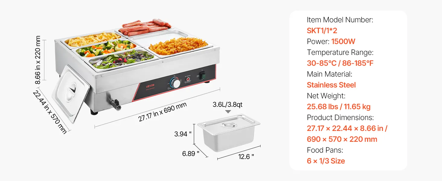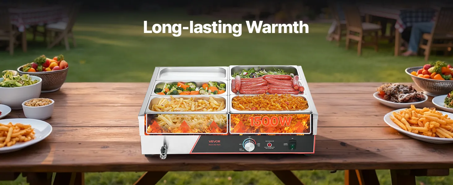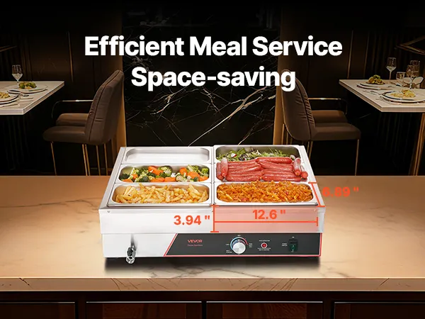 Made of stainless steel for durability and easy cleaning, this food warming features a wide U-shaped heating tube, adjustable temperature (30-85°C / 86-185°F), and a large chamber ideal for hotels, buffets, snack bars, and outdoor parties.
