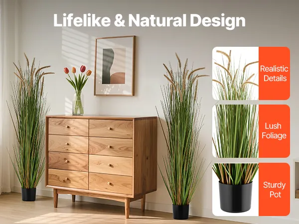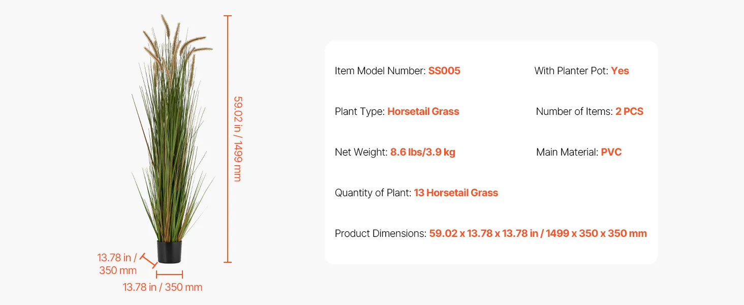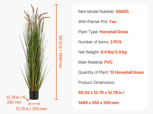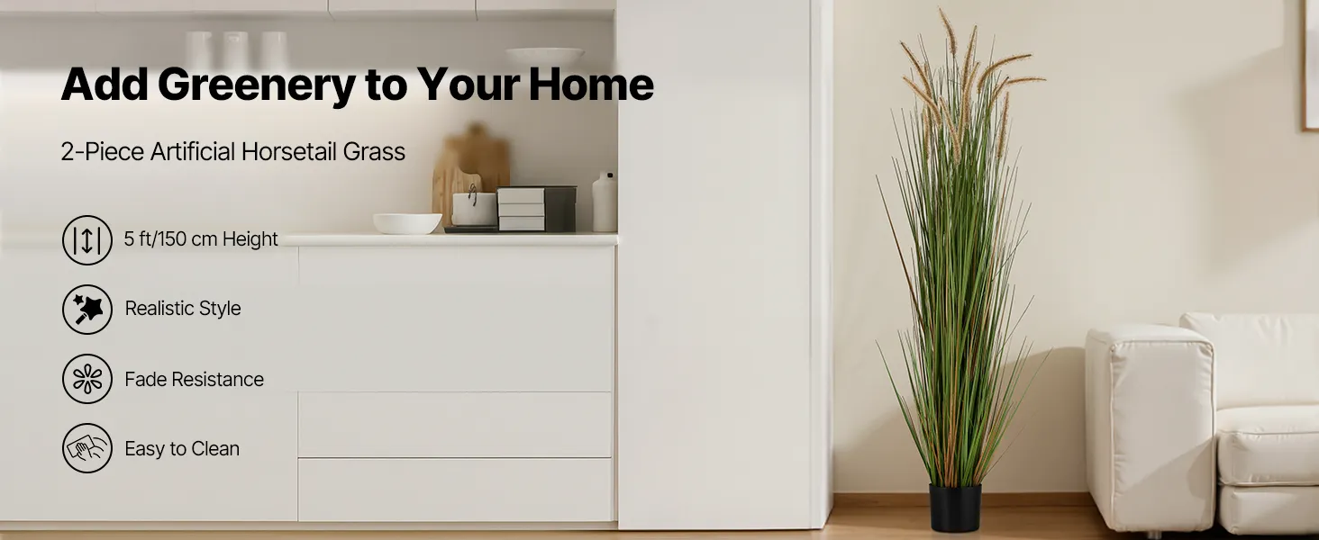 • Fresh Natural Decor: This 2-piece artificial grass plant set stands 5 ft (150 cm ) tall, and each stem features thirteen horsetail grass. It brings a natural, elegant touch to your living space, creating a natural surrounding