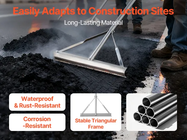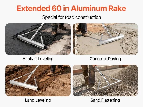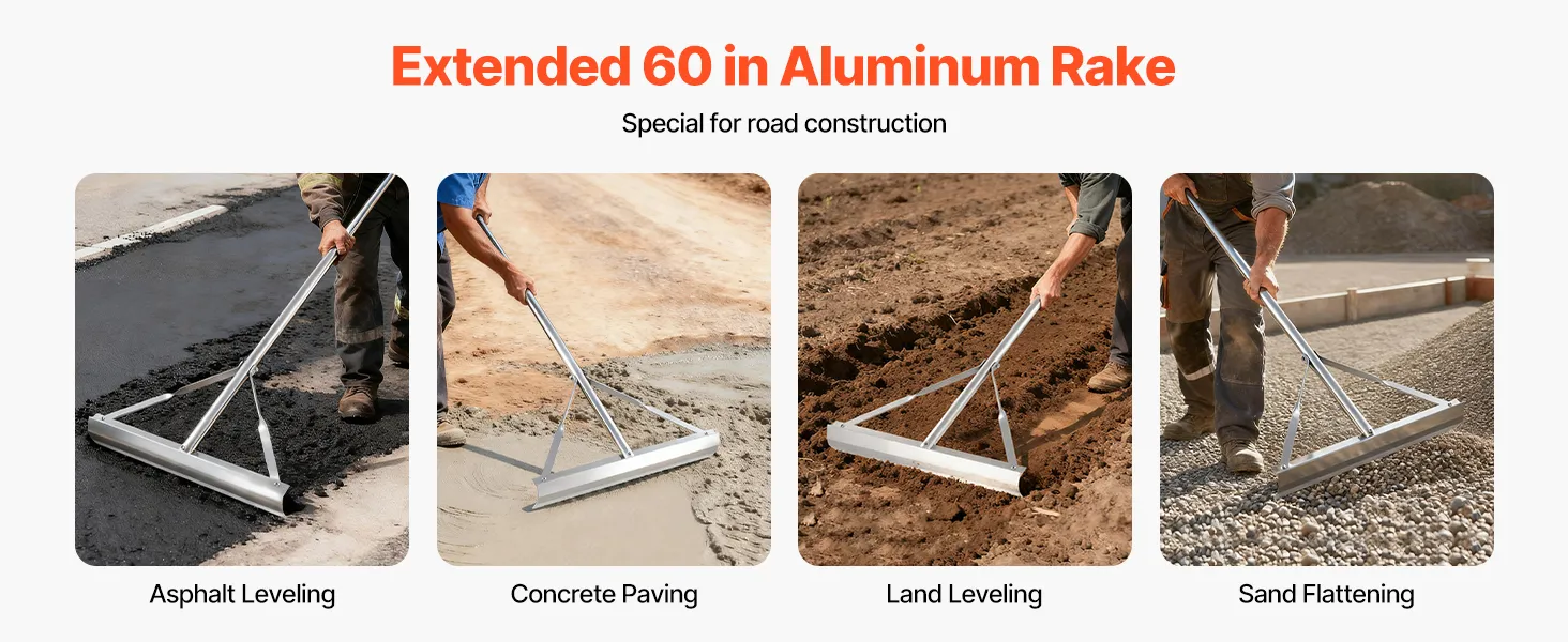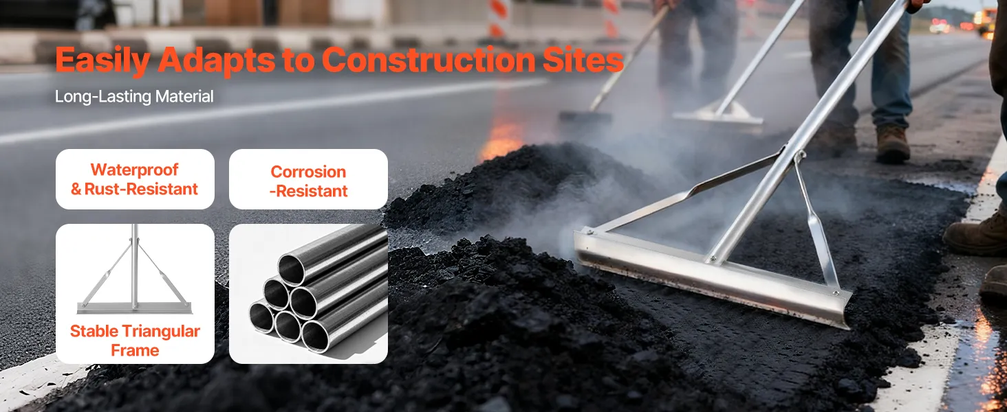 Made of an aluminum alloy handle and head, reinforced with a sturdy triangular frame, the leaf rake is water- and rust-resistant, corrosion-resistant, and maintains shape. It is suitable for road construction, asphalt leveling, and ensuring long-term outdoor use.