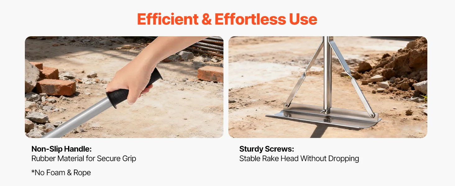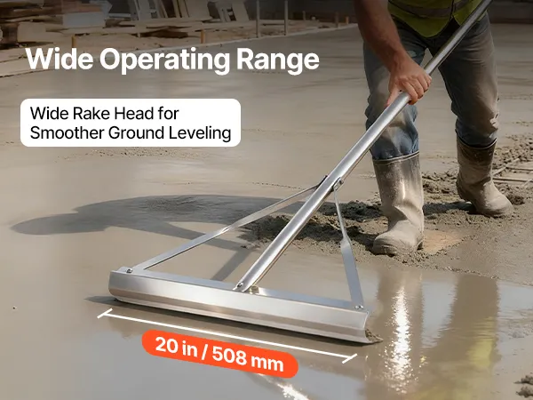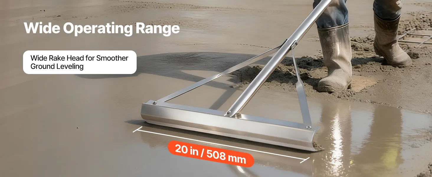 Our landscaping rake features a 20 in wide rake head. This design makes it achieve more uniform concrete leveling over a large area and improve road surface smoothness.