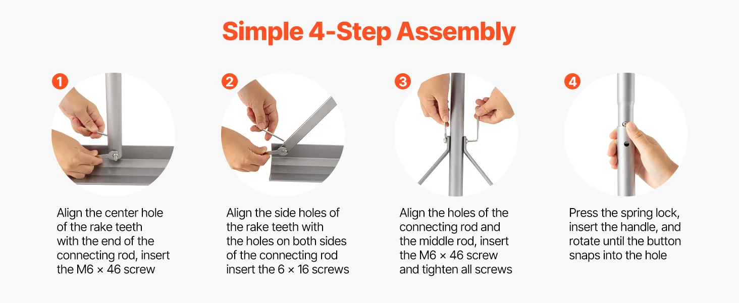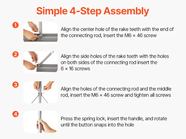 This lawn rake requires no complicated assembly steps. Its spring-lock mechanism allows quick assembly and disassembly with a simple press, suitable for all users.
