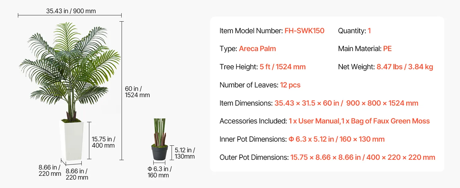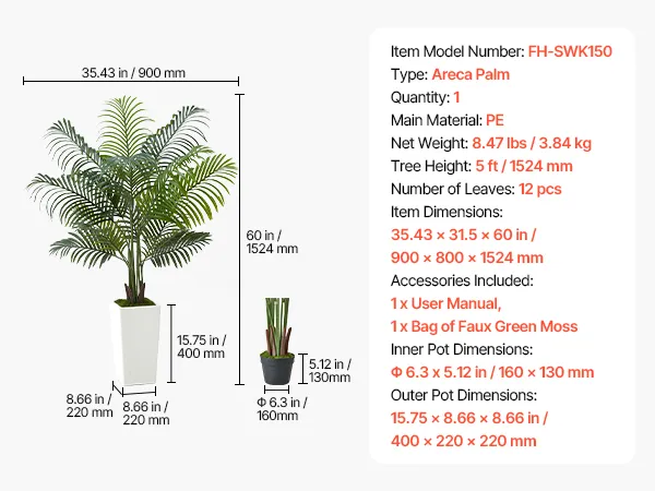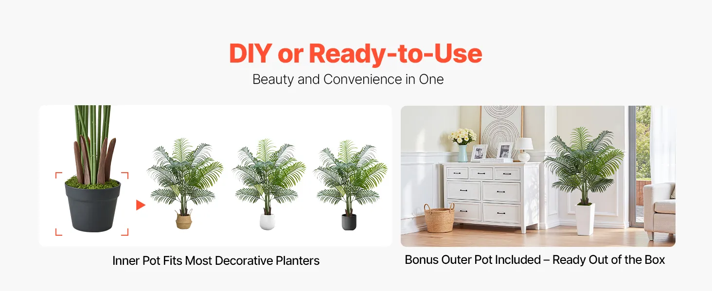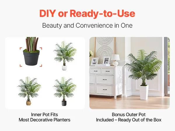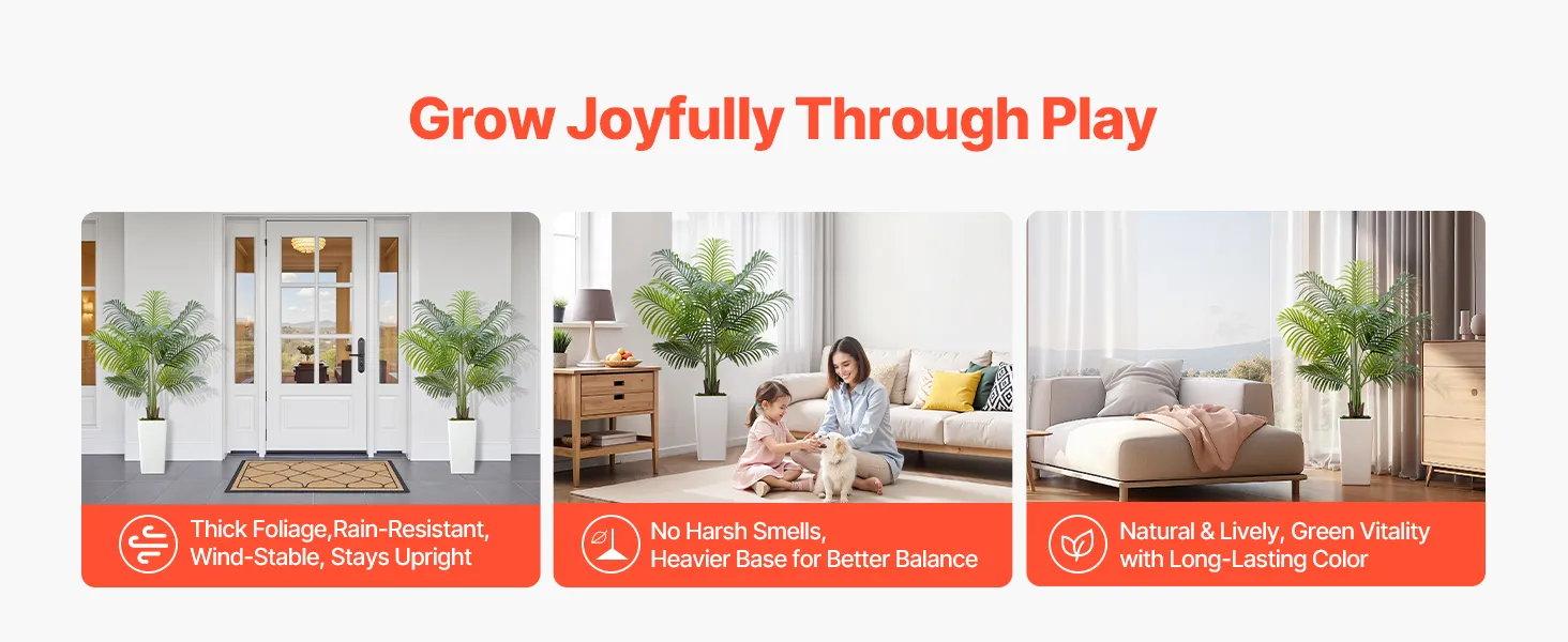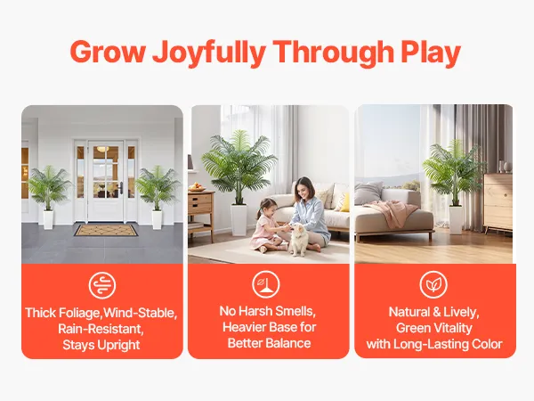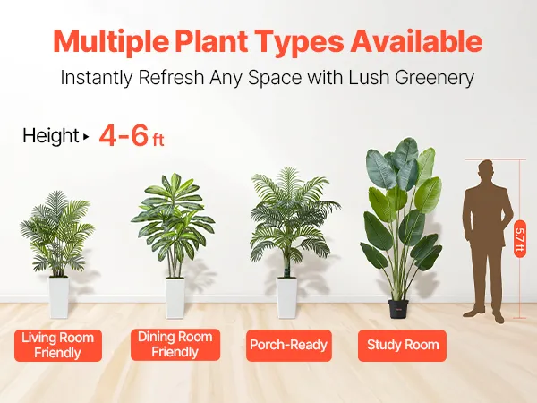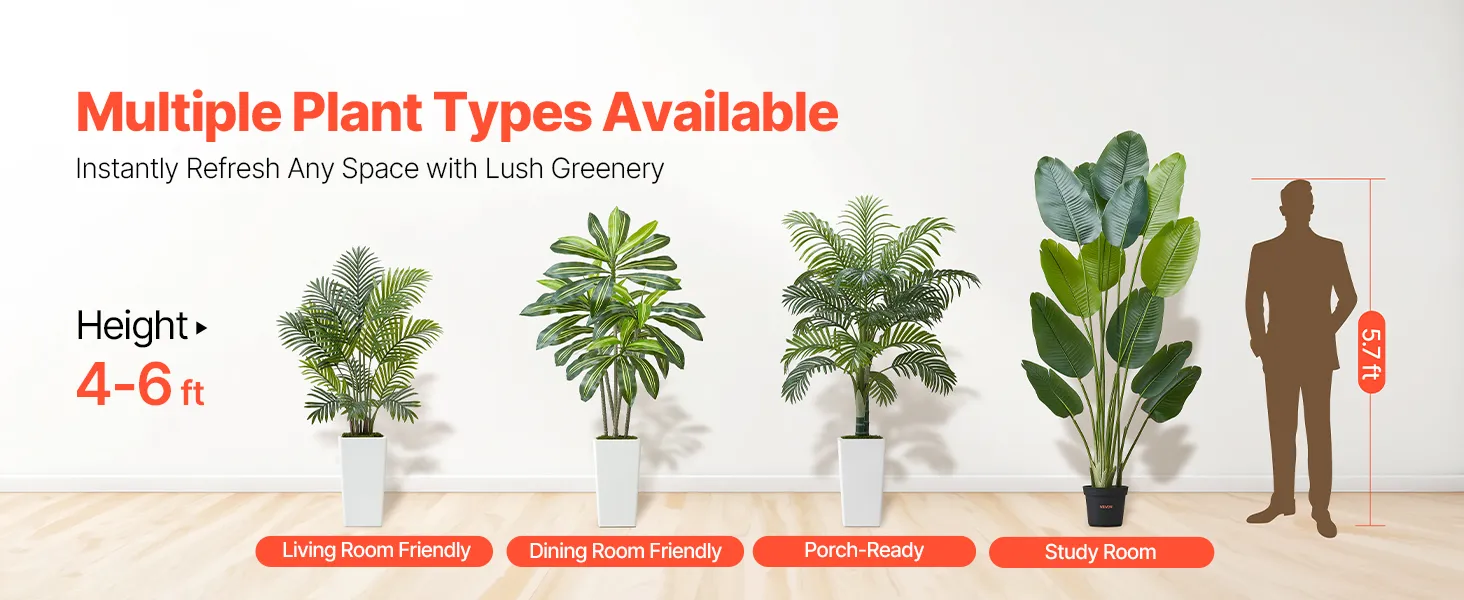 Features 4 tropical plant types: thick-trunk areca palm, dracaena, areca palm, and bird of paradise. Ranges 4–6 ft tall with realistic PE leaves. Waterproof, low-light friendly, easy to clean, and maintenance-free.