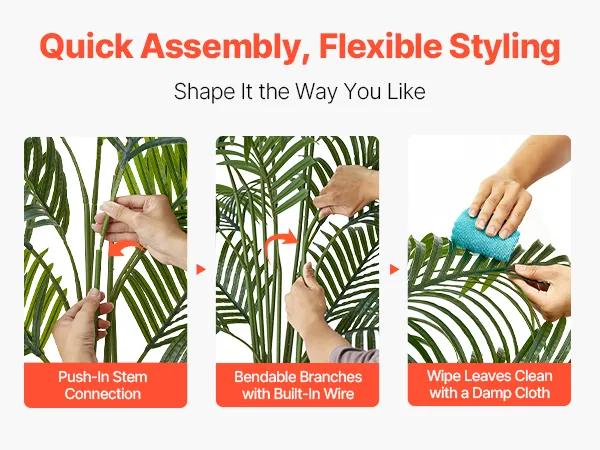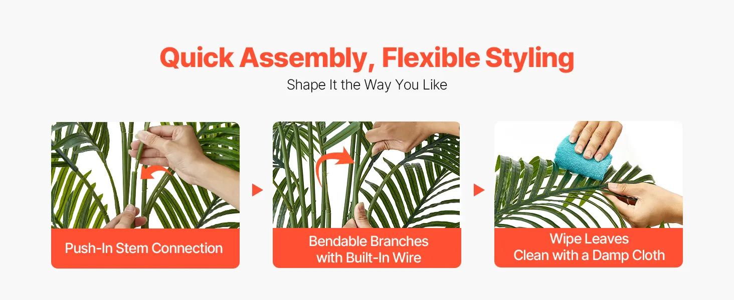 Insert-style connections make stem assembly easy and secure. Adjustable branches allow you to reshape the artificial indoor plants for a more natural curve and realistic appearance.