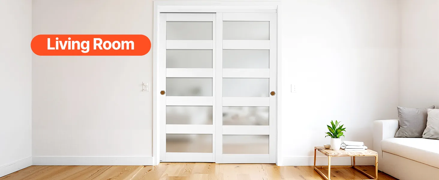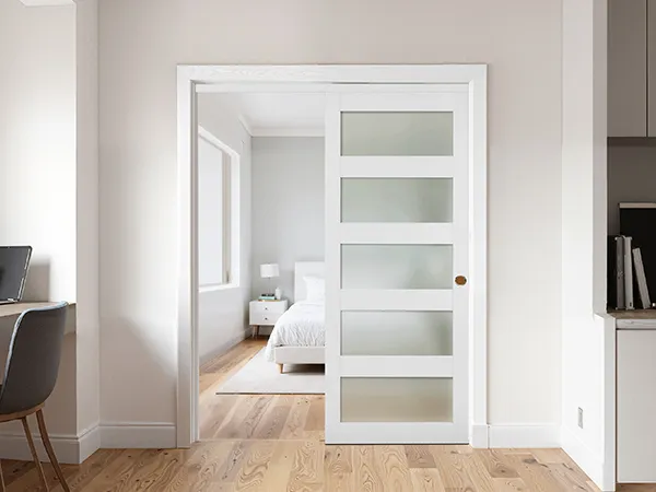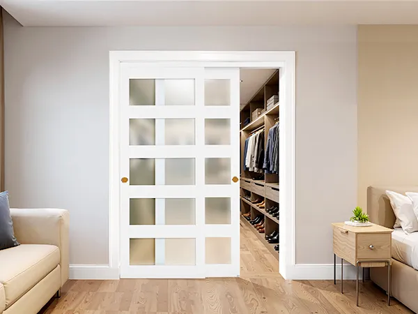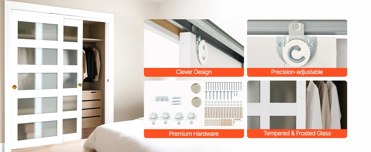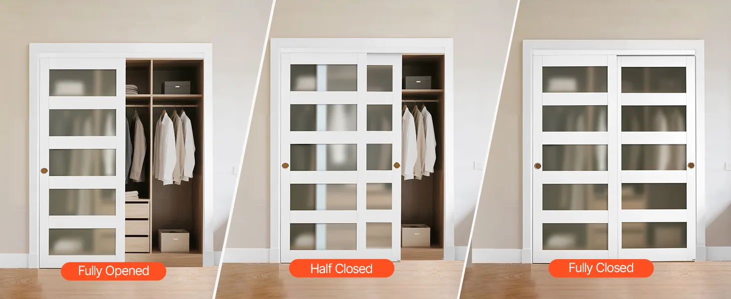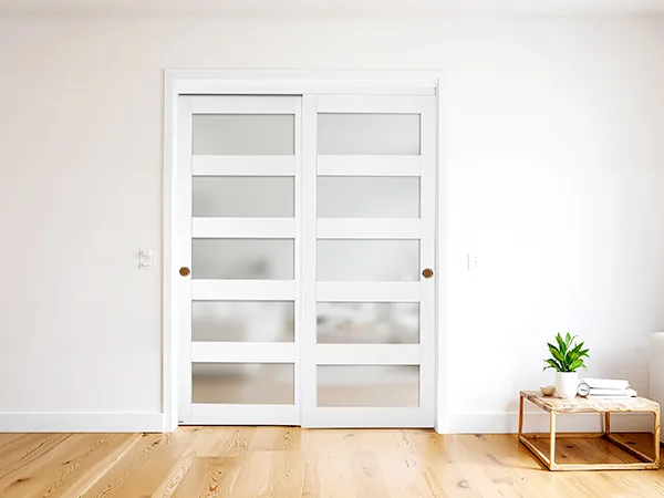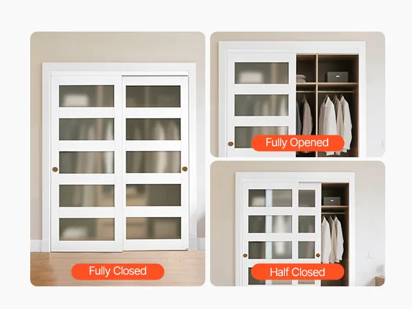 Featuring a durable wood frame, waterproof surface, and 5-Lite frosted tempered glass, our sliding closet doors provide smooth sliding while saving space. Each door panel size: 787 mm (W) x 1986mm (H), thickness: 22 mm. Fits door openings of 1524 x 2032 mm.