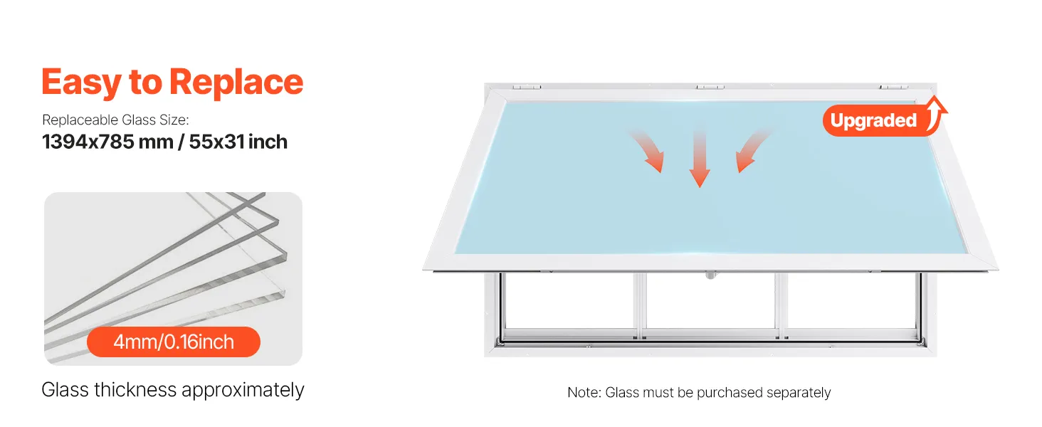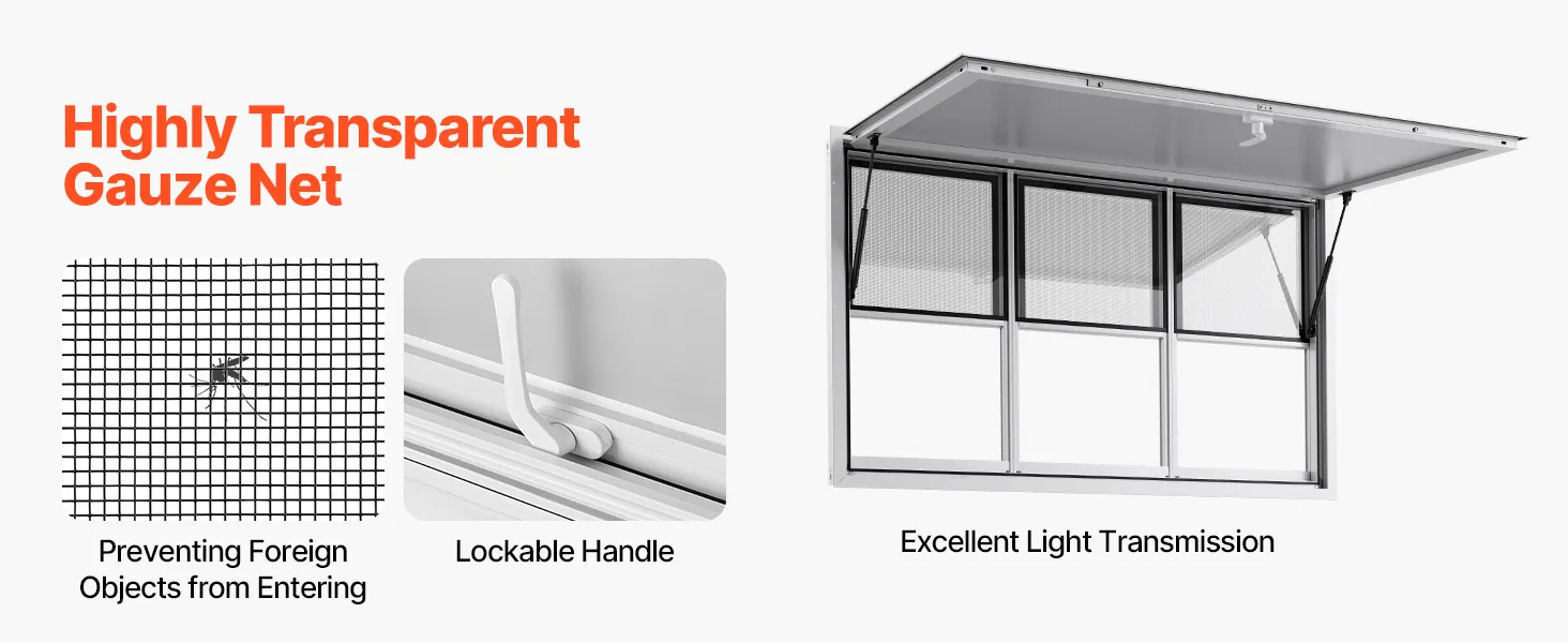 Q1: Are the window dimensions precise? Will it fit my food cart/counter?A1: Strict size control! The window frame installation size is 1524x915 mm / 60x36 inch, suitable for standard food cart/counter openings. Please measure your installation space before purchasing.Q2: Is the acrylic (PMMA) prone to cracking or scratching?A2: Highly durable! The upgraded 4mm PMMA acrylic offers impact resistance superior to regular glass, able to withstand bumps from food carts and harsh environments like high heat and oil fumes.Q3: Can the hydraulic rods stably support an 85° opening angle?A3: Dual hydraulic rods provide strong support! Using 420 series hydraulic rods (150mm stroke), the window opens and closes smoothly and can stay suspended at any angle—ideal for frequent use scenarios.Q4: Are the locking points prone to rusting?A4: Galvanized anti-rust treatment! Locking points feature a zinc alloy coating and pass a 72-hour salt spray test, offering better rust resistance than ordinary locks for long-term outdoor use without worry.Q5: Does it include a screen? How do I clean it?A5: Designed for easy maintenance! This version includes a screen to effectively keep out insects. The window surface can be cleaned with a damp cloth. The frame has a white powder-coated finish that resists oil stains.