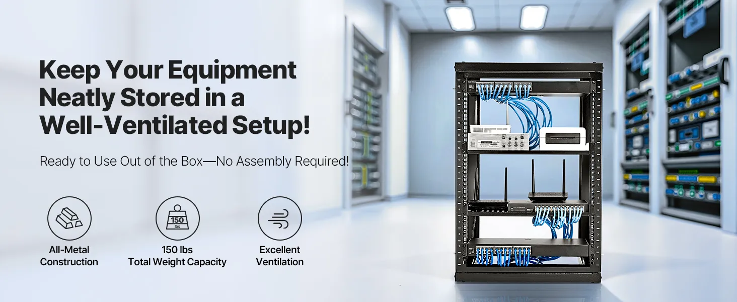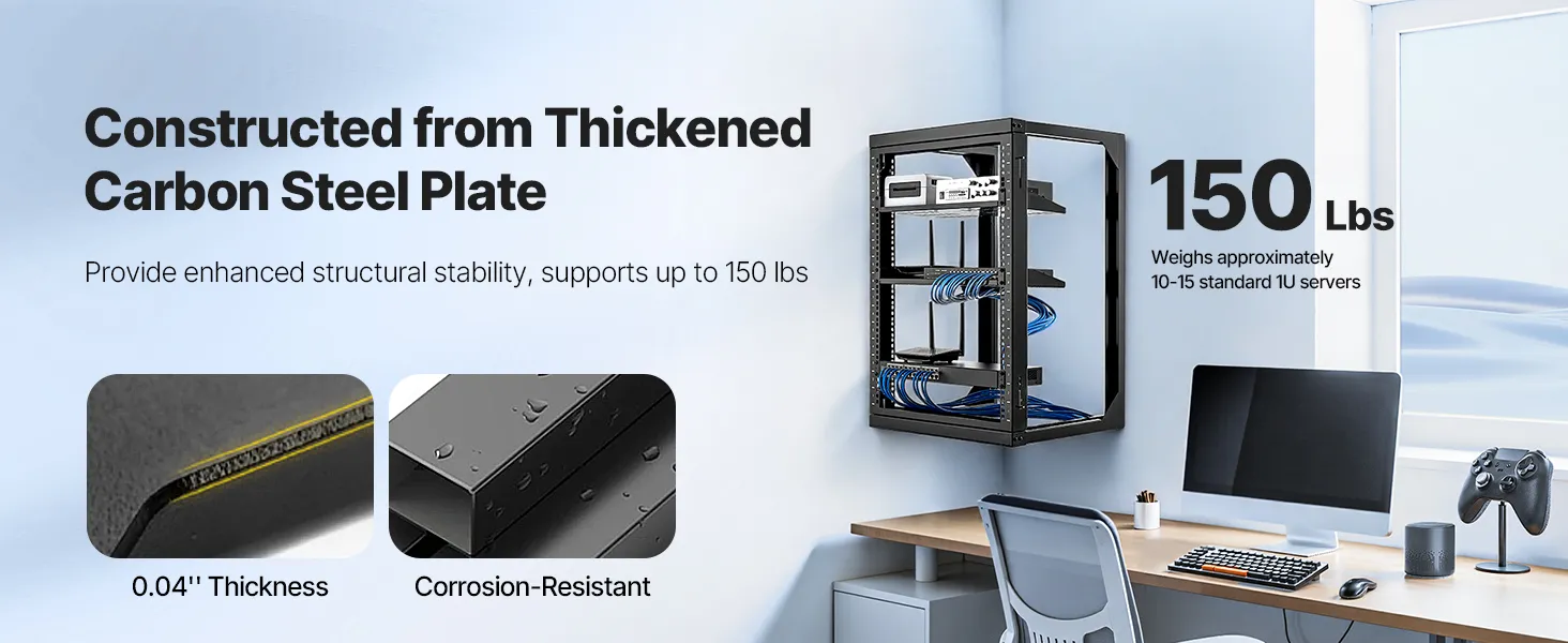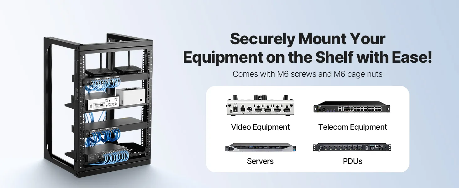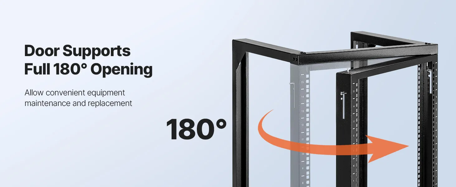 Our network rack features an open hinged door that supports 180° opening. With a solid carbon steel structure, it handles up to 150 lbs (68 kg) to keep your devices stable. With complete accessories, you can securely mount switches or other network devices directly onto the rack!