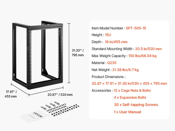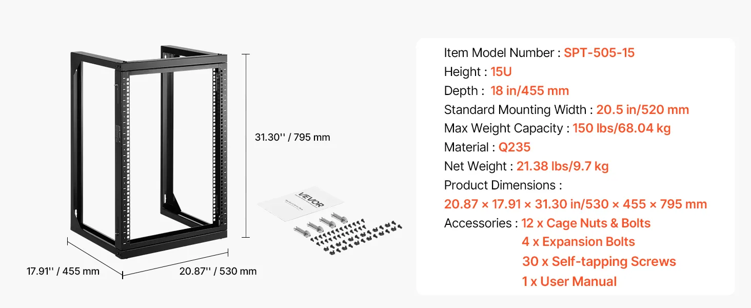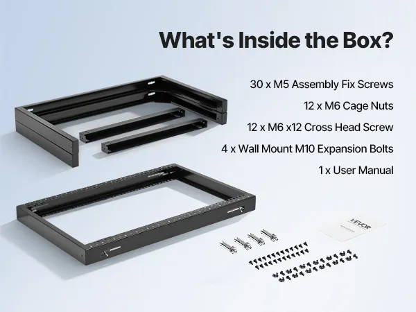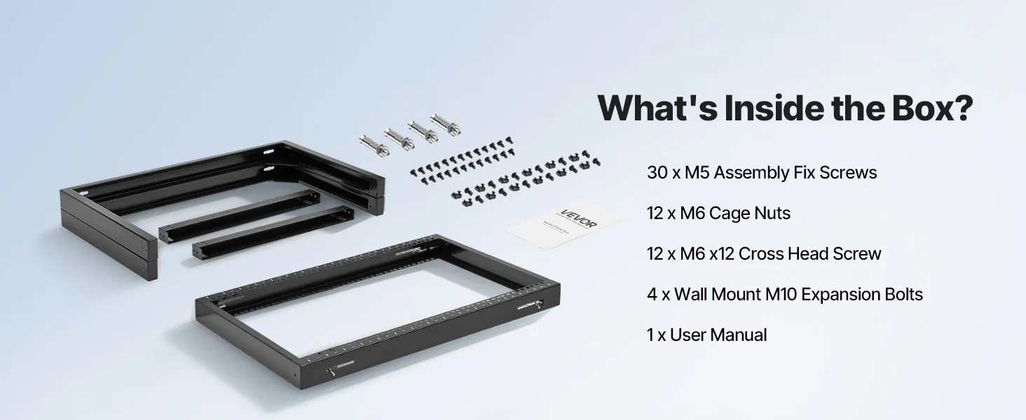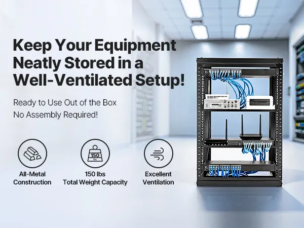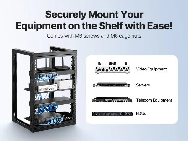 Our network rack features an open hinged door that supports 180° opening. With a solid carbon steel structure, it handles up to 150 lbs (68 kg) to keep your devices stable. With complete accessories, you can securely mount switches or other network devices directly onto the rack!