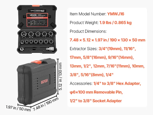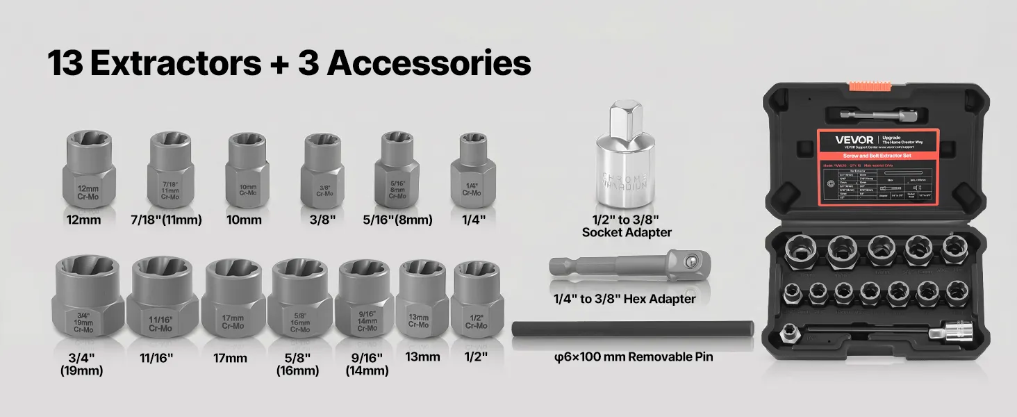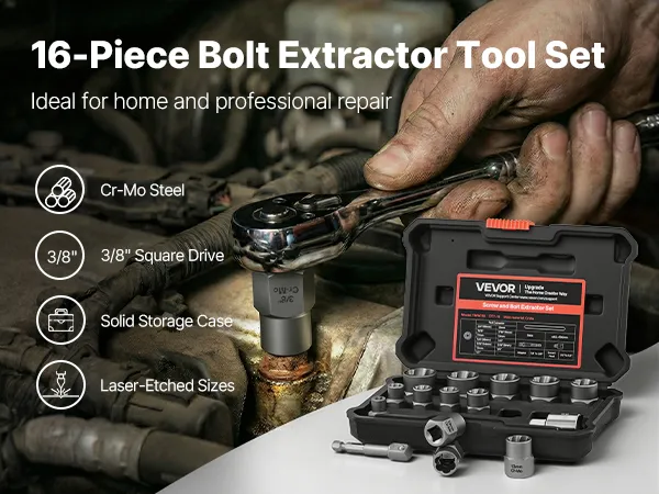 VEVOR Bolt Extractor Kit, 16 Pieces Impact Bolt & Nut Remover Set with Adapters and Pin Punch, Solid Storage Case, Cr-Mo Steel for Removing Damaged, Rusted, Stripped, Rounded Bolts, Nuts and Screws