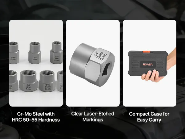 The straightforward removal method of the extractor socket set helps you stay in control, even with damaged or seized bolts.
