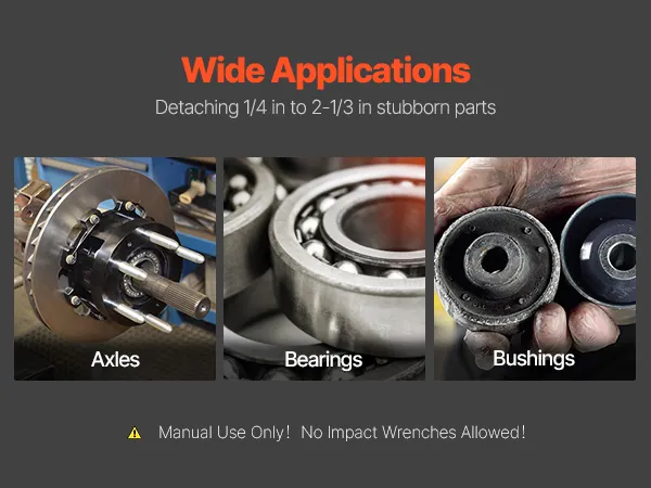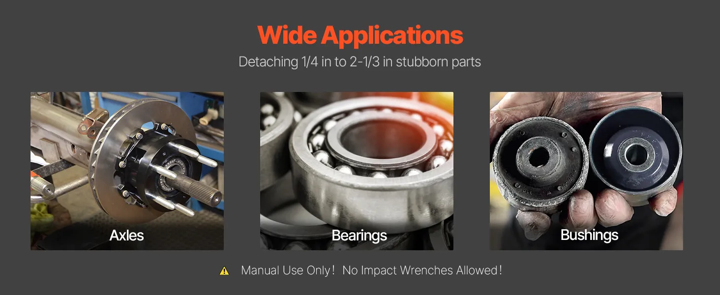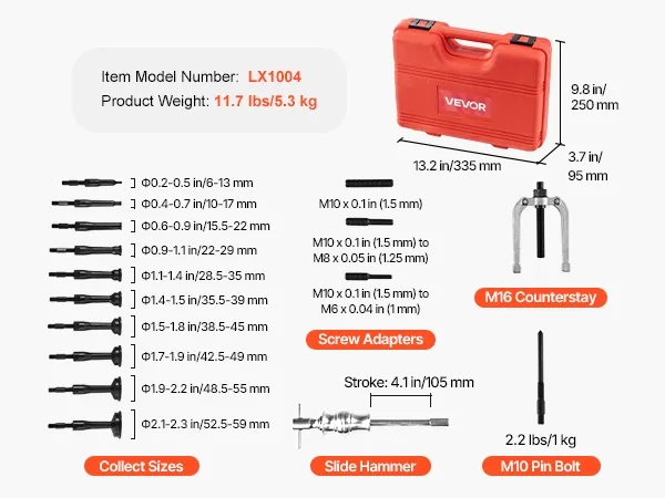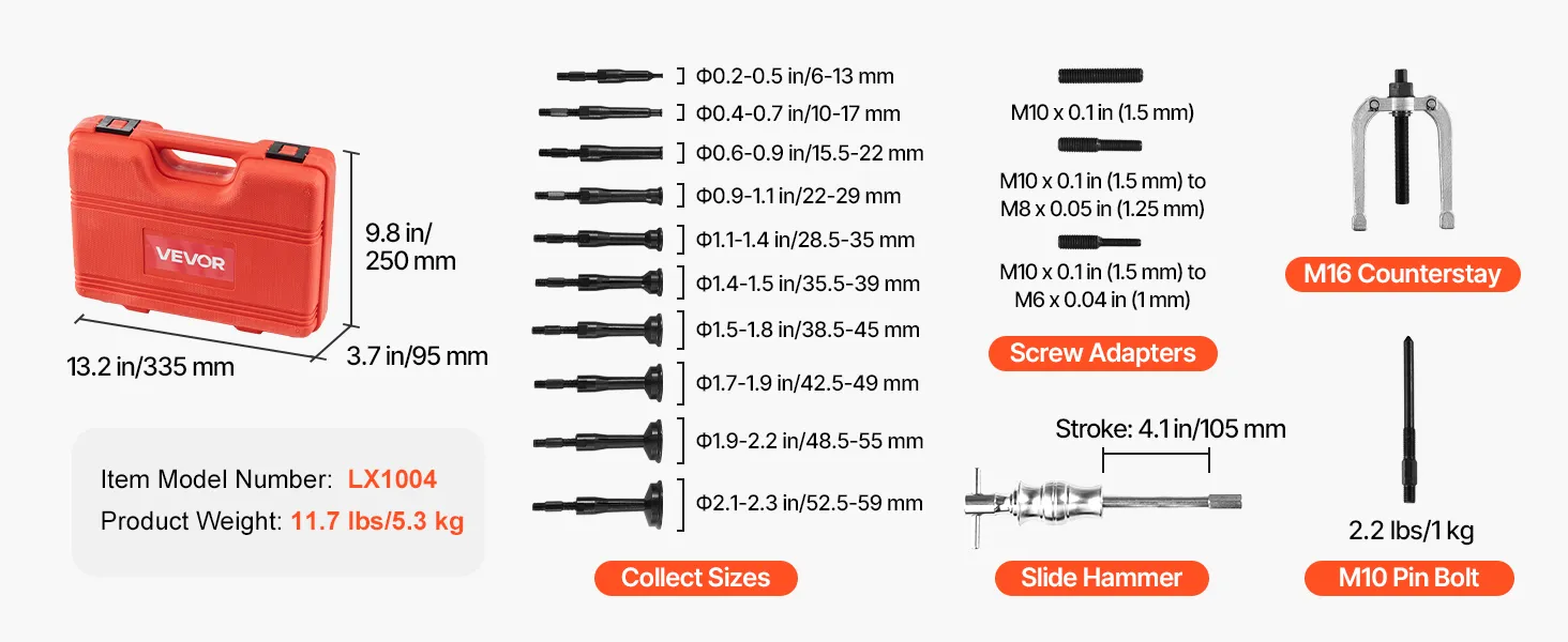 Our slide hammer puller is compatible with various car models, providing ten collect sizes to detach parts ranging from 1/4 to 2-1/3 inches (6-59 mm) in diameter.