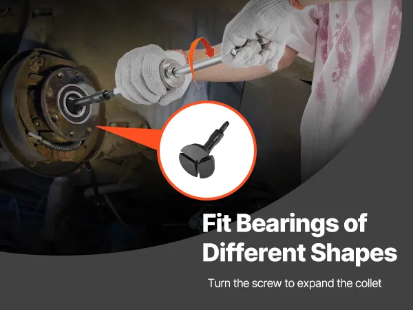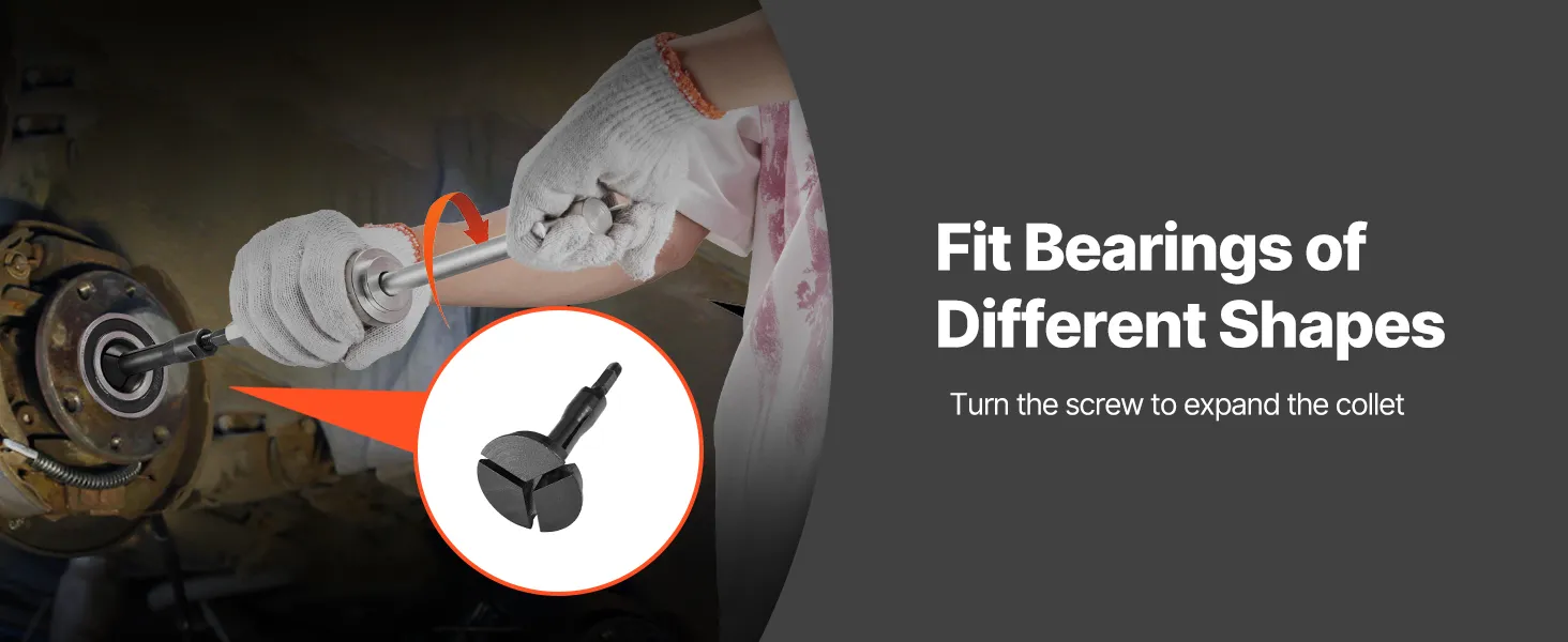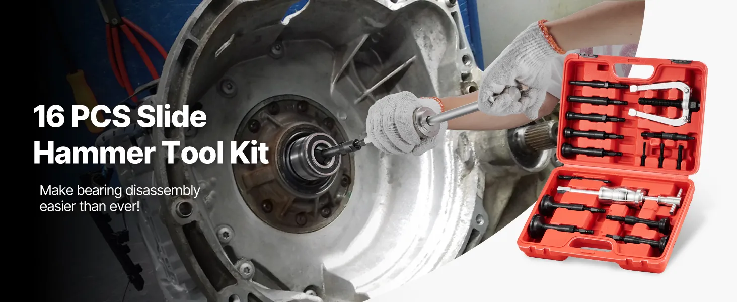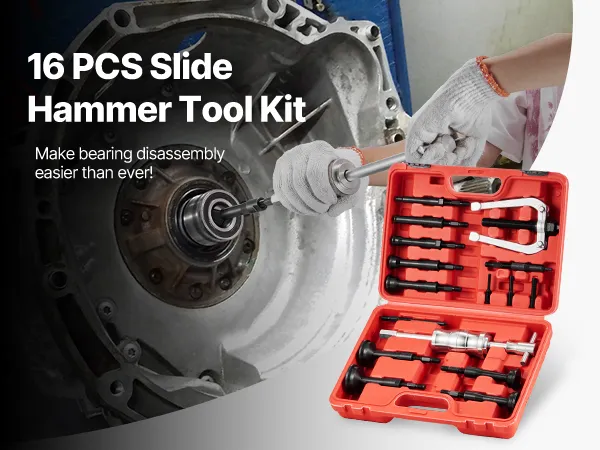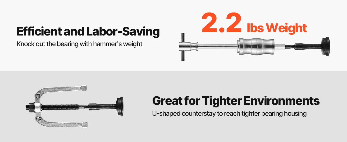 Designed for most vehicles, this slide hammer puller set comes with 10 collet sizes, covering 1/4 to 2-1/3 in (6–59 mm) bearings, shafts, bushings, and more. The hammer-and-collet setup allows for quick impact pulling, while the U-shaped counterstay reaches deep into tight spaces.
