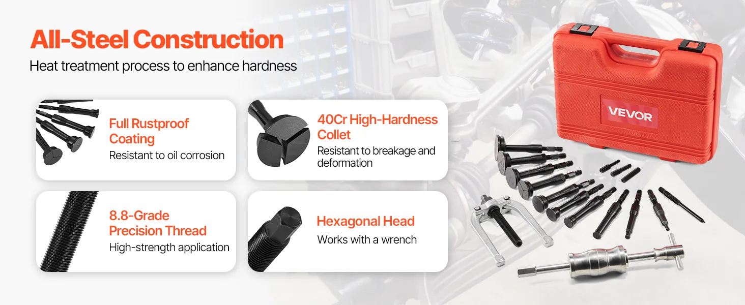 Crafted from high-temperature quenching Cr40 material, our collection maximizes hardness. The slide hammer kit, made of high-hardness steel, resists wear, deformation, and fracture during use.