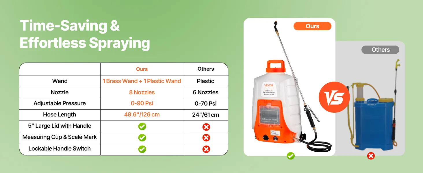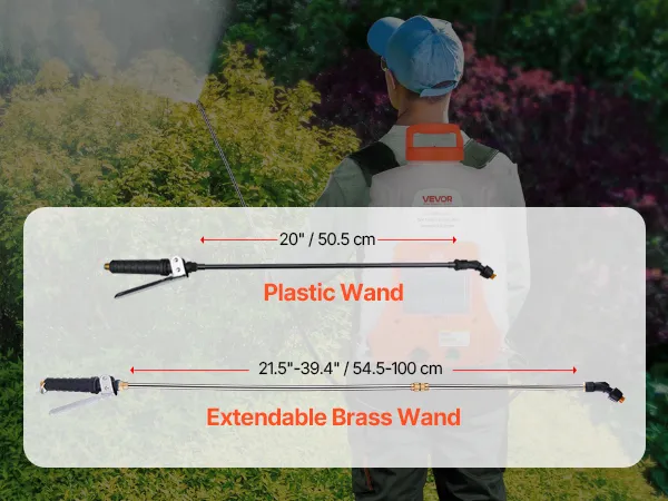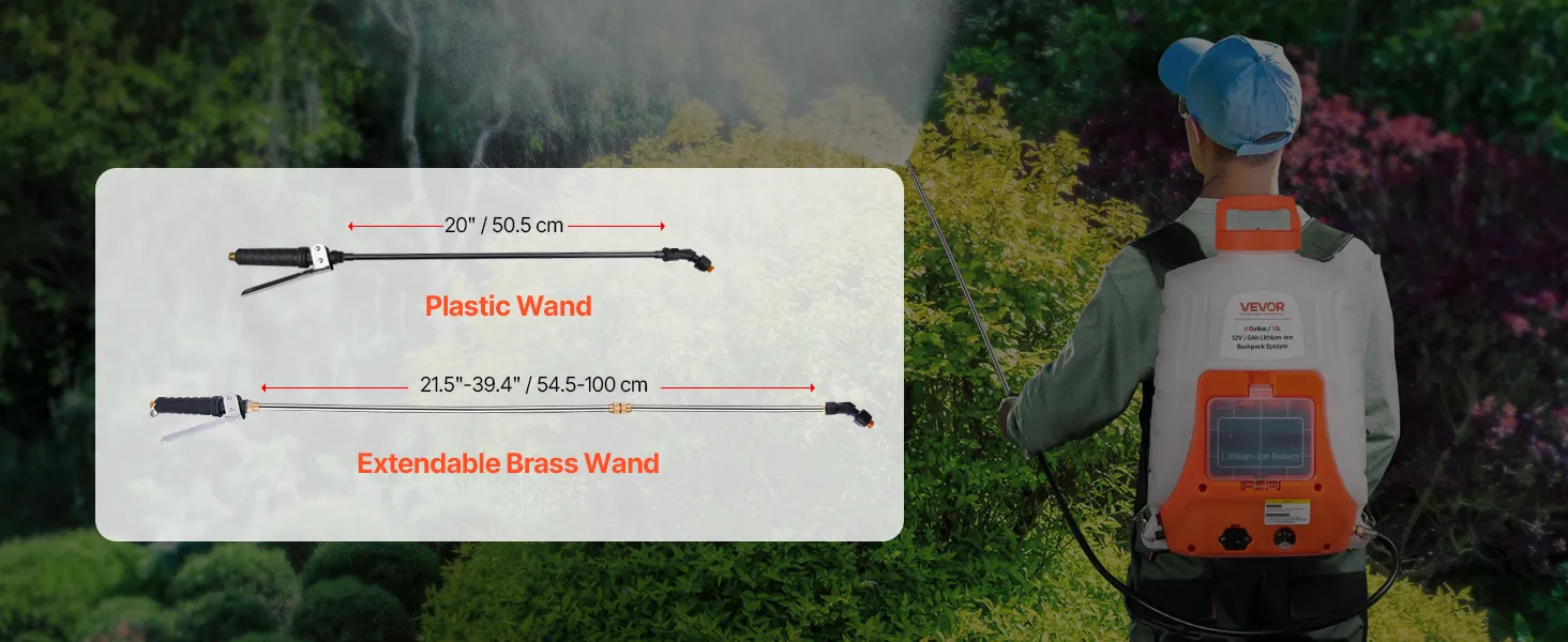 • 8 Nozzles Available: This 4 Gallon electric backpack sprayer comes with 8 nozzles and 2 wands, giving you more options to choose how you spray! The 21.5″-39.4″ adjustable brass wand, plastic wand and 0-90PSI water pressure make this garden sprayer meet your various spraying needs