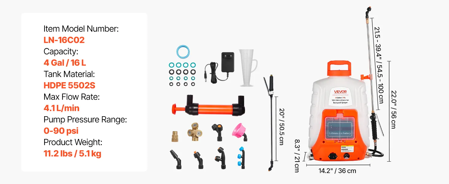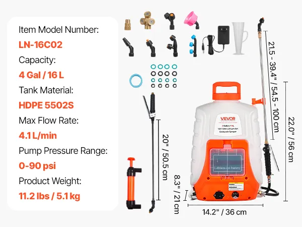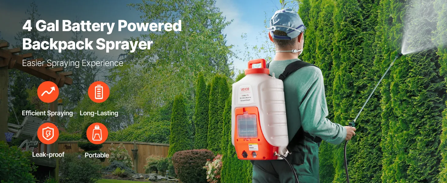 VEVOR 16L аккумуляторный опрыскиватель-ранец, 8 насадок, 2 телескопических штанги, давление 90 PSI, 4–6 ч работы