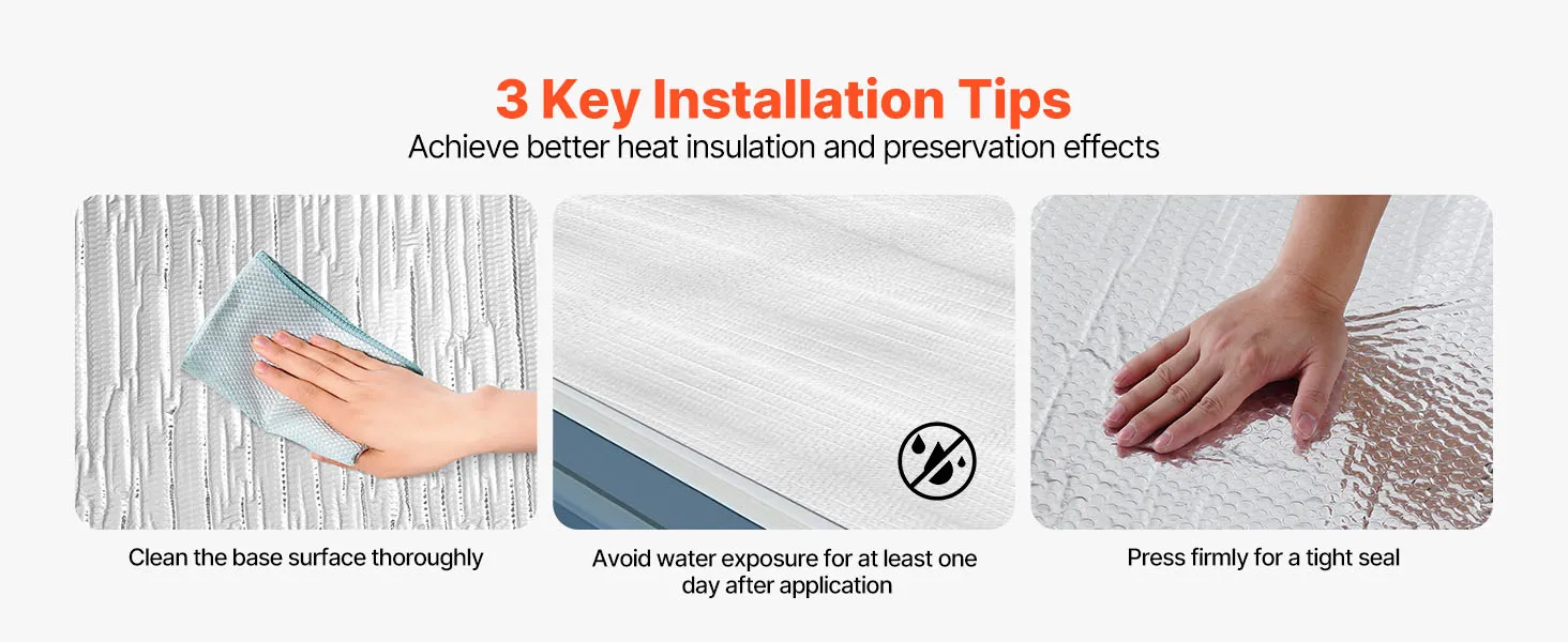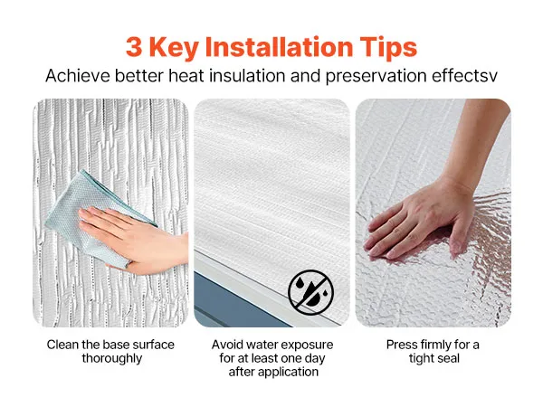 To maximize thermal insulation effectiveness, follow 3 installation tips: maintain a clean and dry base surface, avoid water exposure for at least one day after application, and press firmly for a tight seal and optimal insulation performance.