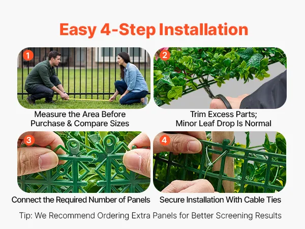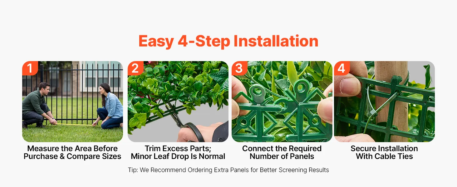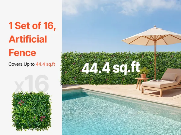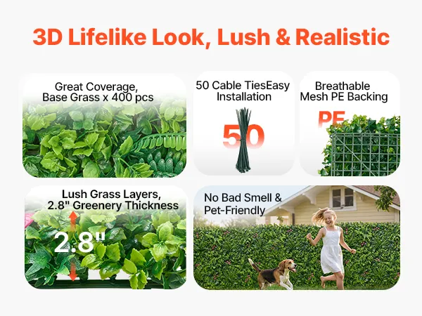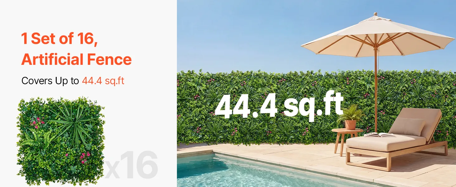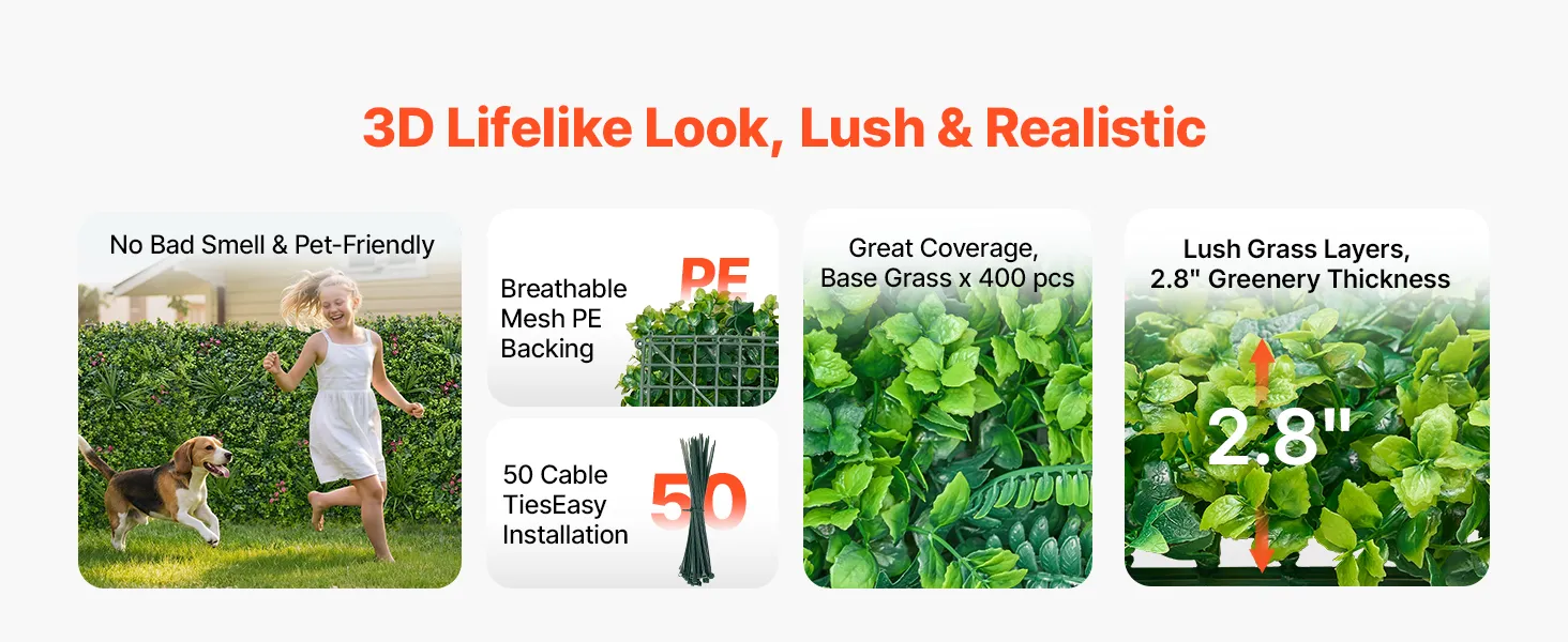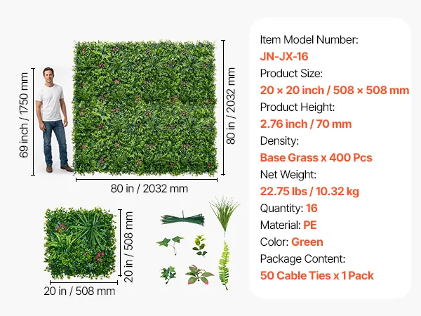 • 16 Panels for Flexible Coverage: Each artificial boxwood panel measures 20 x 20 in. When combined, the set covers up to 44.4 sq ft as a grass wall backdrop. Zip ties are included for easy securing, and panels can be trimmed with scissors to fit your space