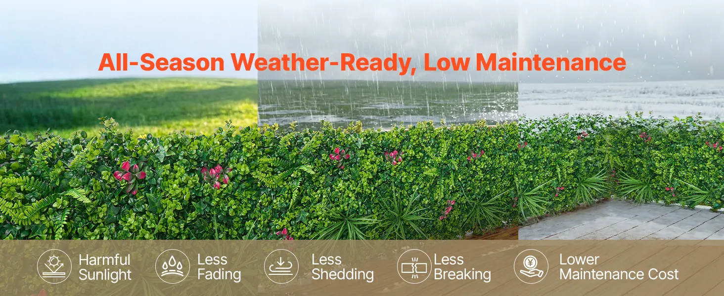 • Fade-Resistant & Low Maintenance: Made from premium PE material, this grass wall is suitable for indoor décor and outdoor sun exposure. It is designed to resist fading, cracking, or shedding, delivering year-round green appeal with no watering required