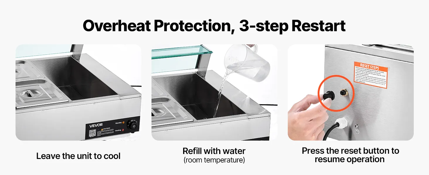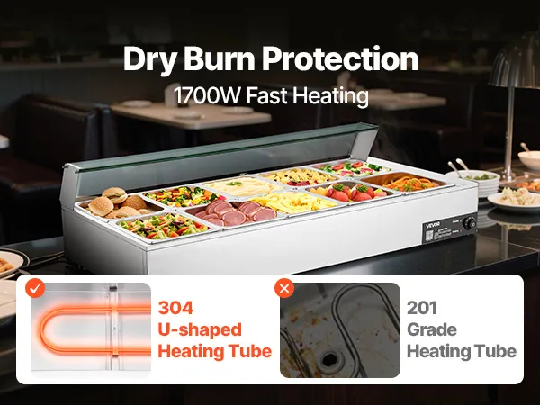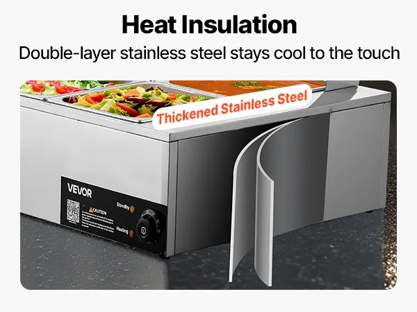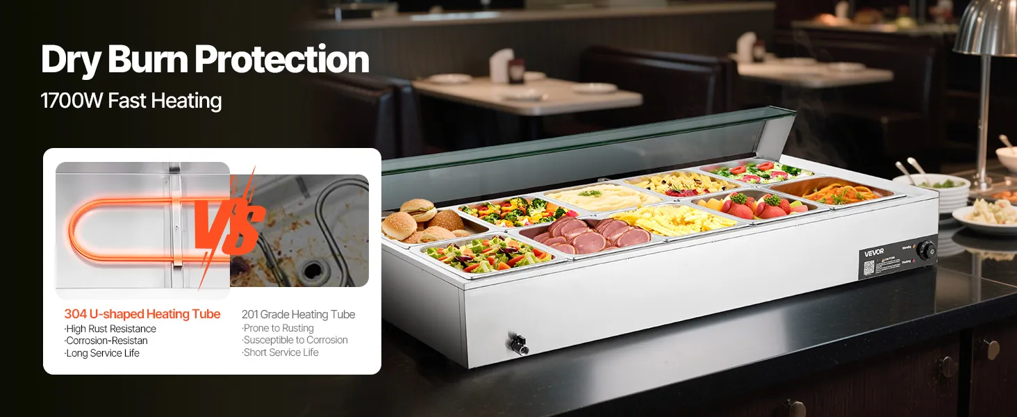 Made of stainless steel for durability and easy cleaning, this food warming features a wide U-shaped heating tube, adjustable temperature (30-85°C / 86-185°F), and a large chamber ideal for hotels, buffets, snack bars, and outdoor parties.