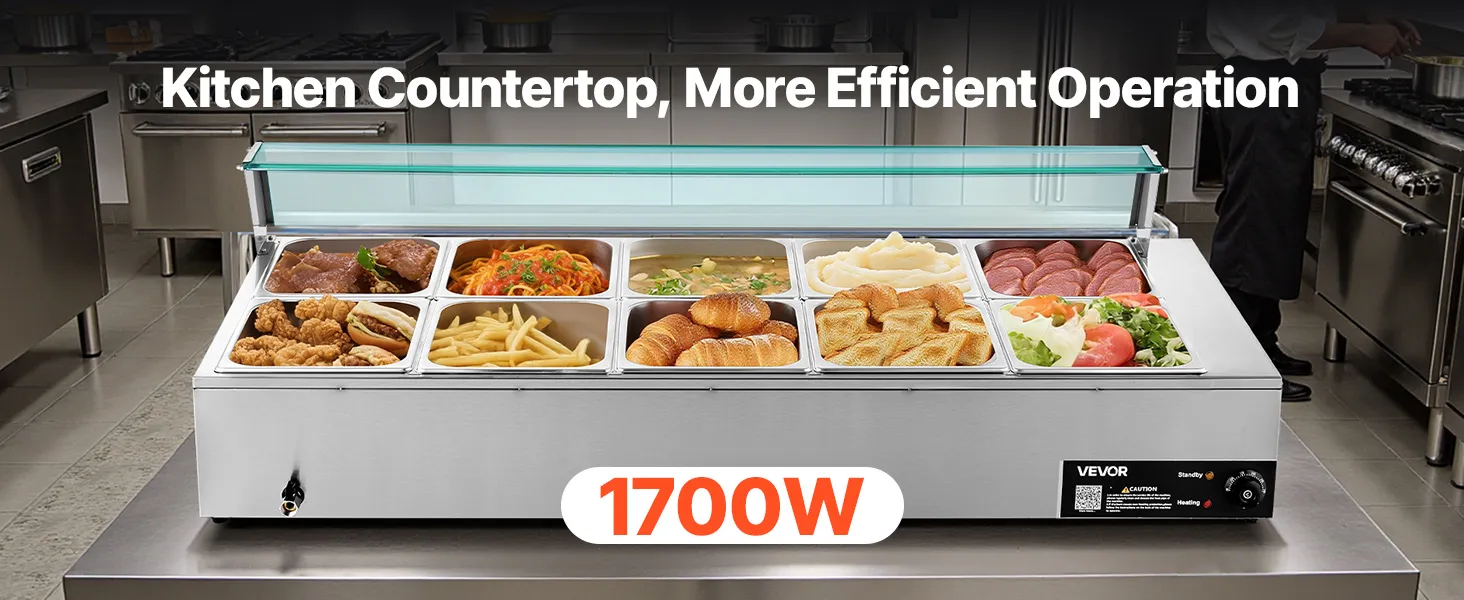 VEVOR Commercial Food Warmer, 1700W Electric Stainless Steel Steam Food Warmer with Glass Cover, 10-Pan Countertop Buffet Bain Marie with Soup & Perforated Ladles, for Catering, Restaurant & Party