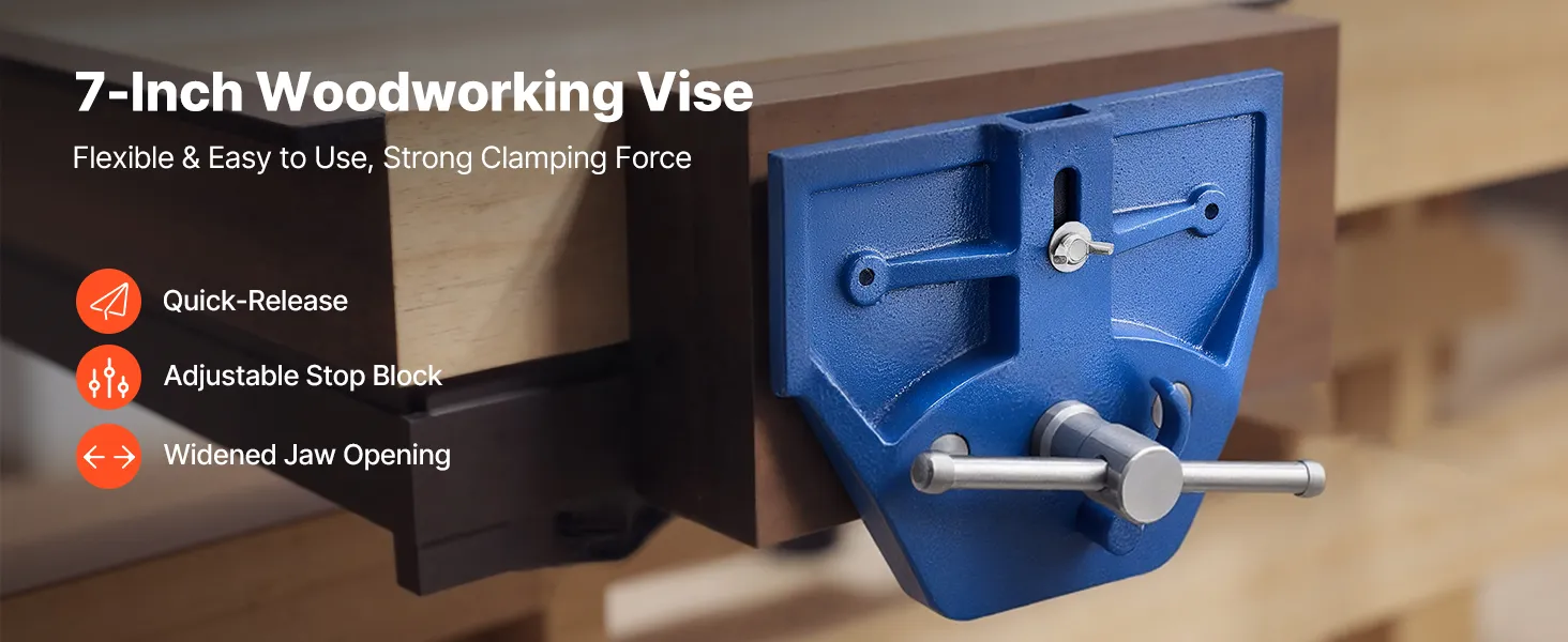 VEVOR Woodworking Vise, 7 Inch Jaw Width, Quick Release Wood Bench Vise, 8 Inch Max Jaw Opening, Heavy-duty Cast Iron Construction, Workbench Vice with Adjustable Front Stop, for Woodworking Drilling