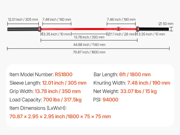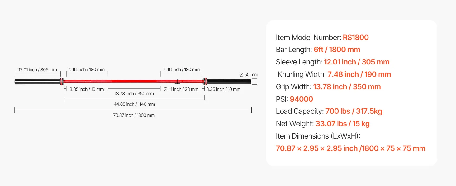 This bench press bar supports up to 700 lbs / 317.51 kg with a tensile strength of 94,000 PSI. Featuring brass bushings, needle bearings, and diamond knurling, it ensures stability, secure grip, and comfortable handling for effective strength training.