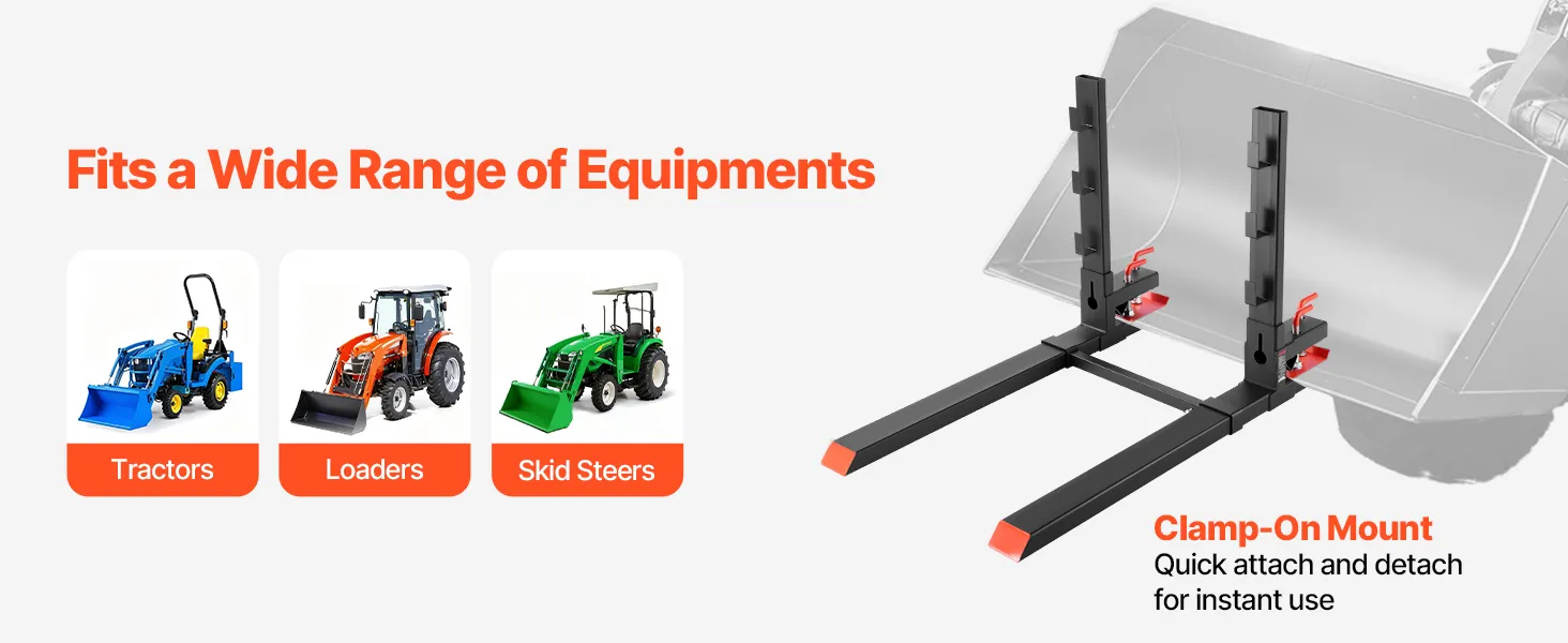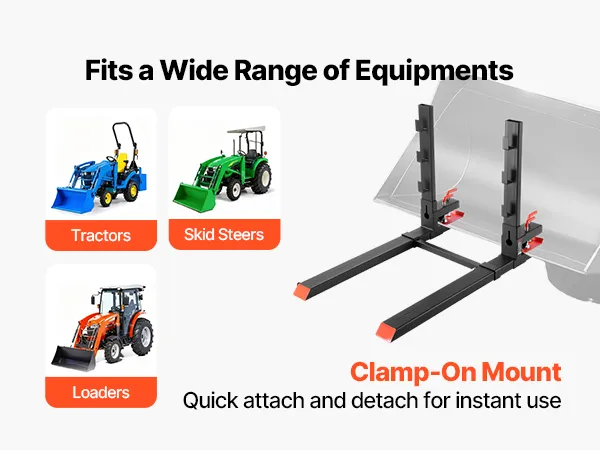 The clamp on pallet forks attach to most tractors, loaders, and skid steers with simple clamps. You skip buying a dedicated forklift, boost handling efficiency, and keep jobs moving securely.