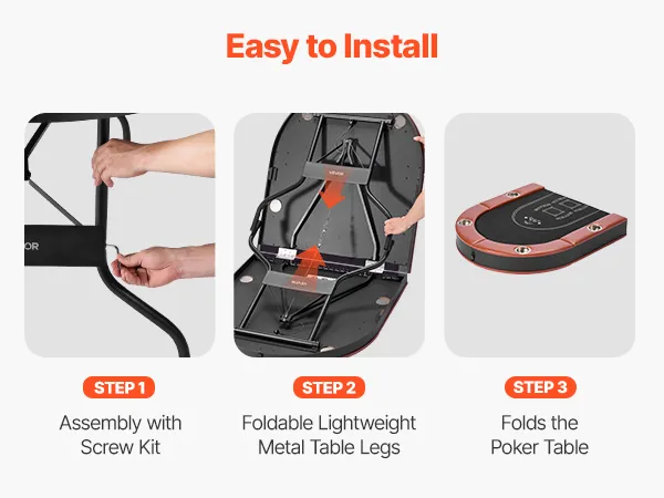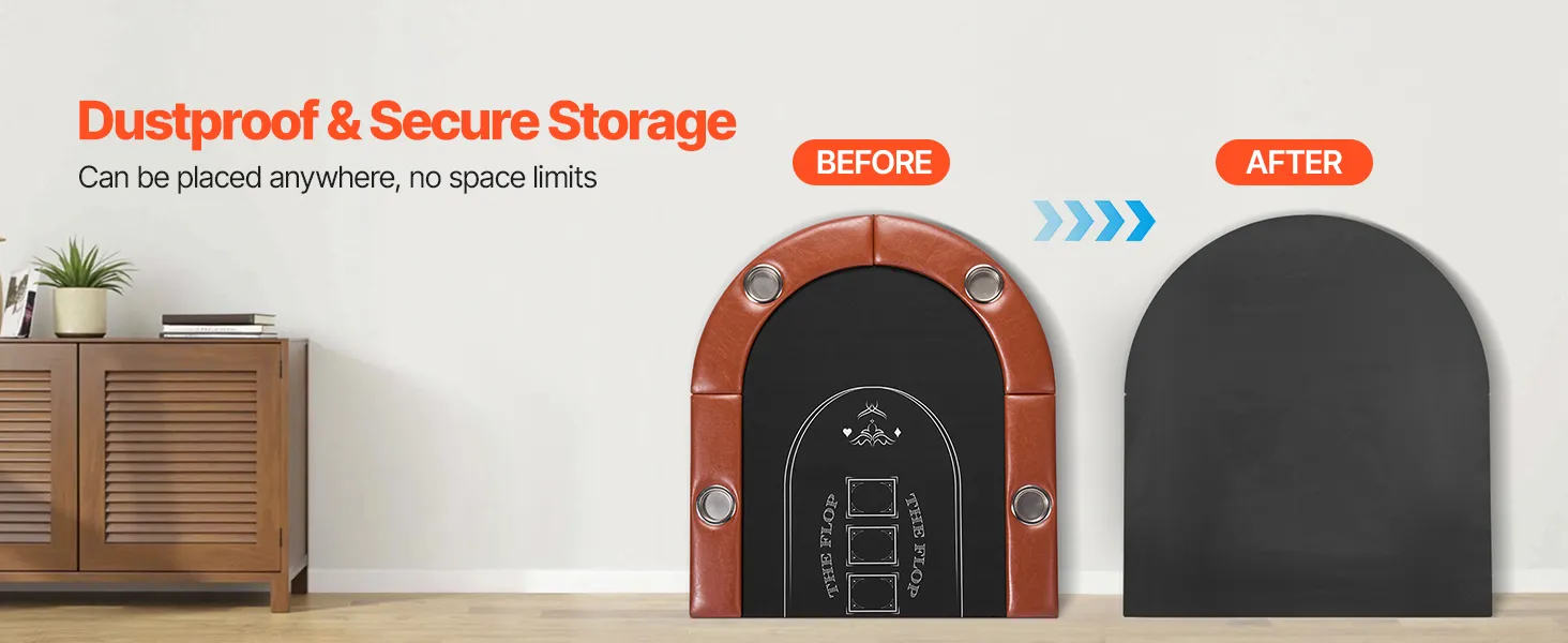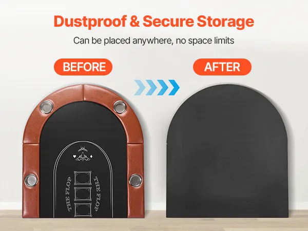 • Простая сборка: Складная конструкция с замком безопасности обеспечивает быструю установку и складывание игрового стола казино. Замок обеспечивает устойчивость стола в сложенном виде. Легко храните его в углу и поддерживайте чистоту благодаря прилагаемому пылезащитному чехлу.