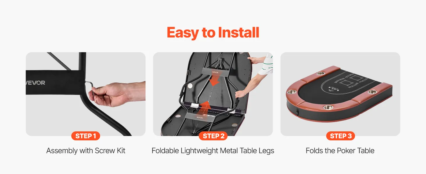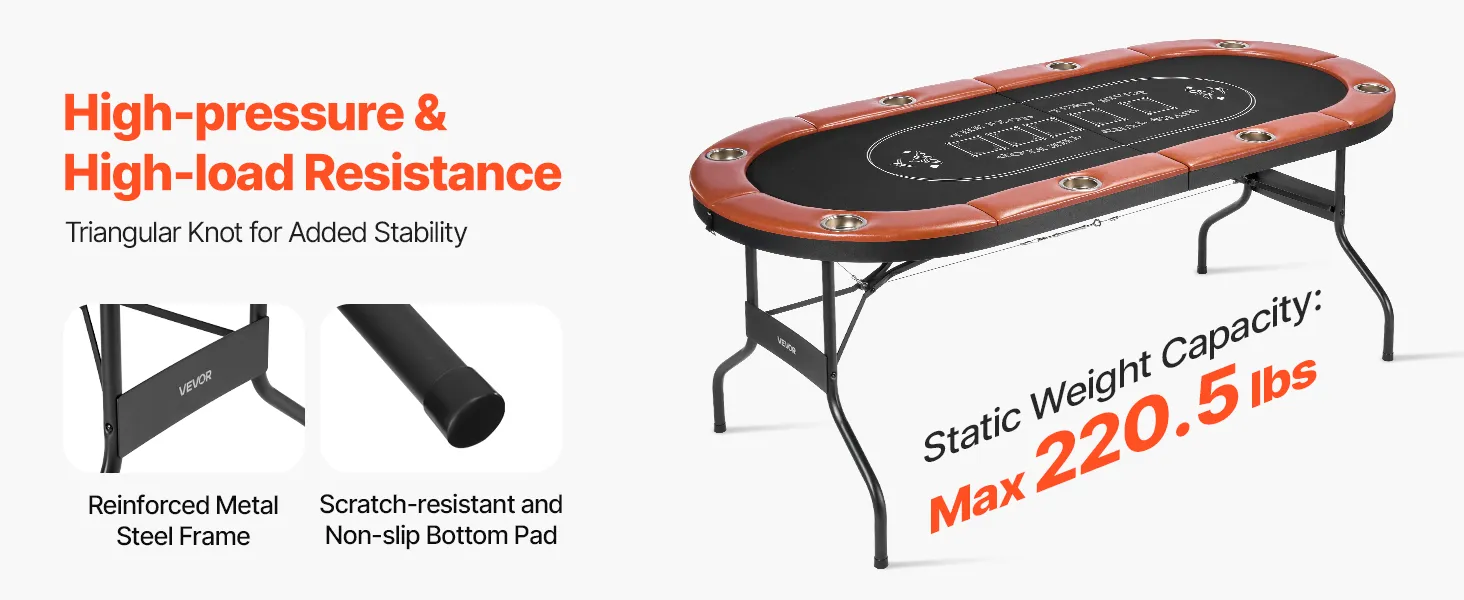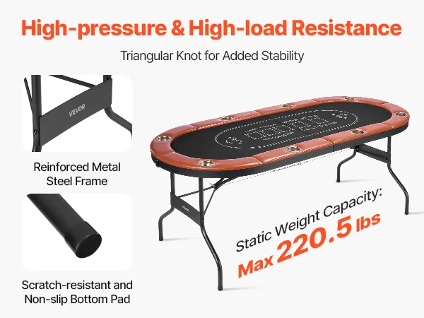 • Устойчивая и прочная конструкция: Этот стол для игры в техасский холдем на 8 игроков имеет усиленный металлический каркас и плиту МДФ. Прочные металлические ножки выдерживают высокое давление при длительном использовании, а треугольная опора для ножек обеспечивает устойчивость и долговечность