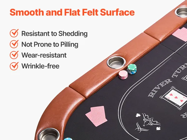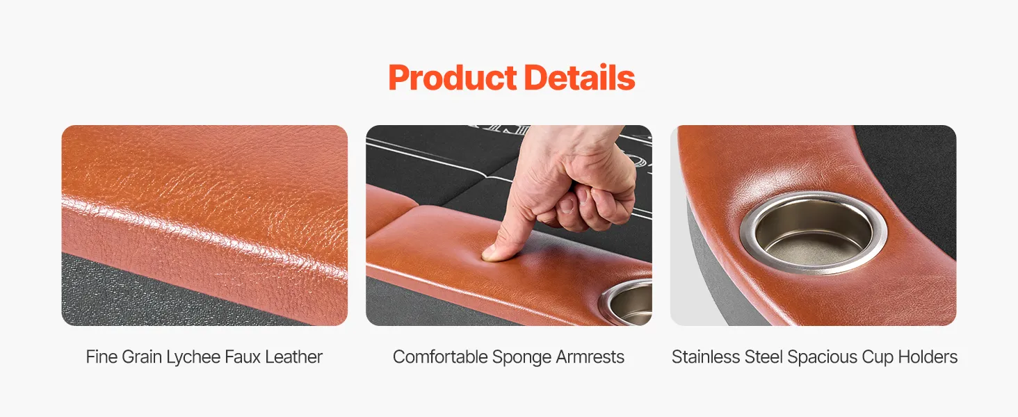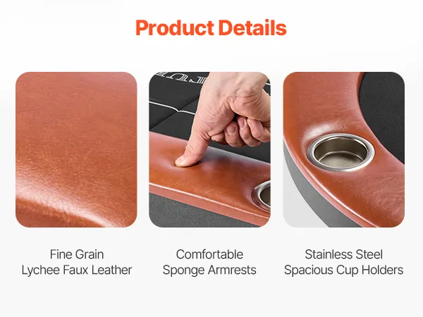 • Водонепроницаемая мягкая обивка: Подлокотники этого портативного покерного стола обиты толстым поролоном и обернуты водонепроницаемой искусственной кожей. Прочная конструкция поддерживает ваши руки и тело, предохраняя вас от проливаний и дискомфорта.