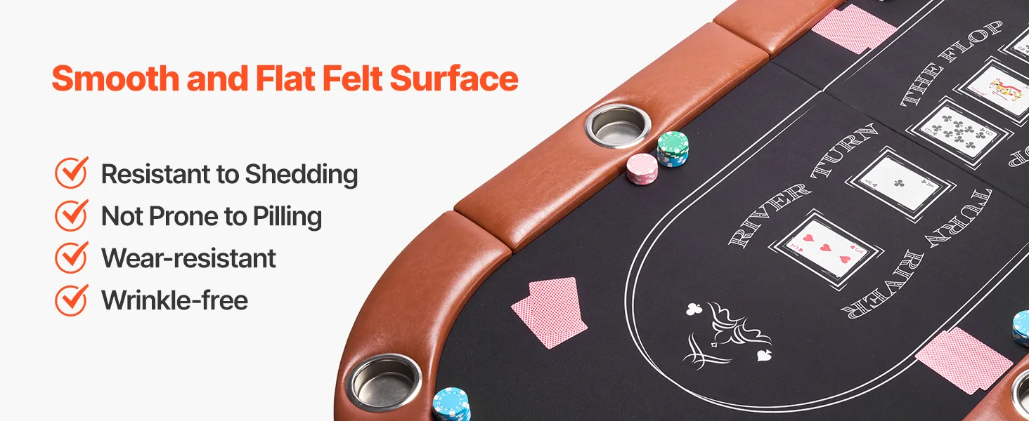 • 8 Подстаканников и войлочная поверхность: В каждую позицию игрока за покерным столом встроен металлический подстаканник, обеспечивающий большее пространство для напитков. Войлок для казино снижает шум при падении предметов и облегчает подбор карт.