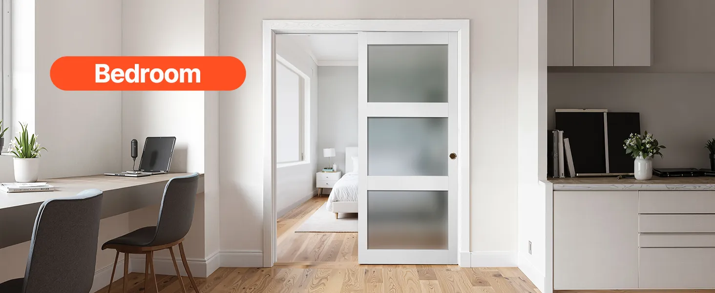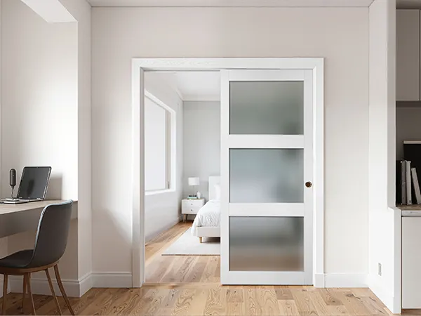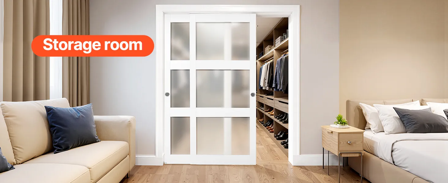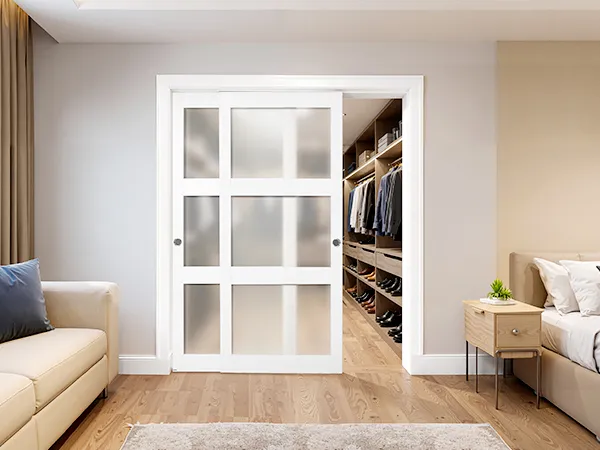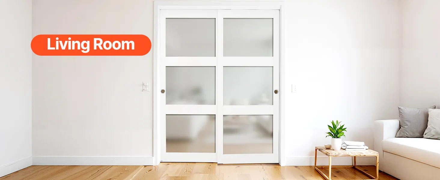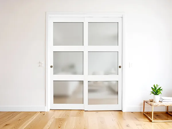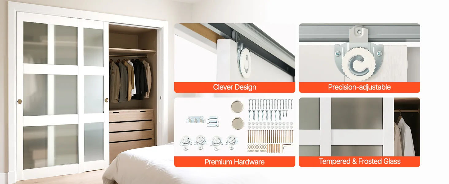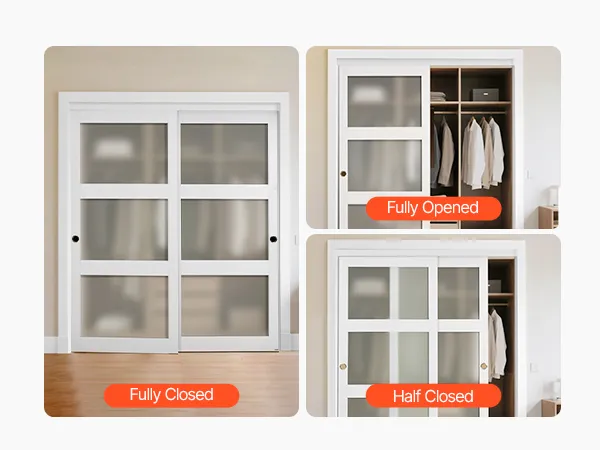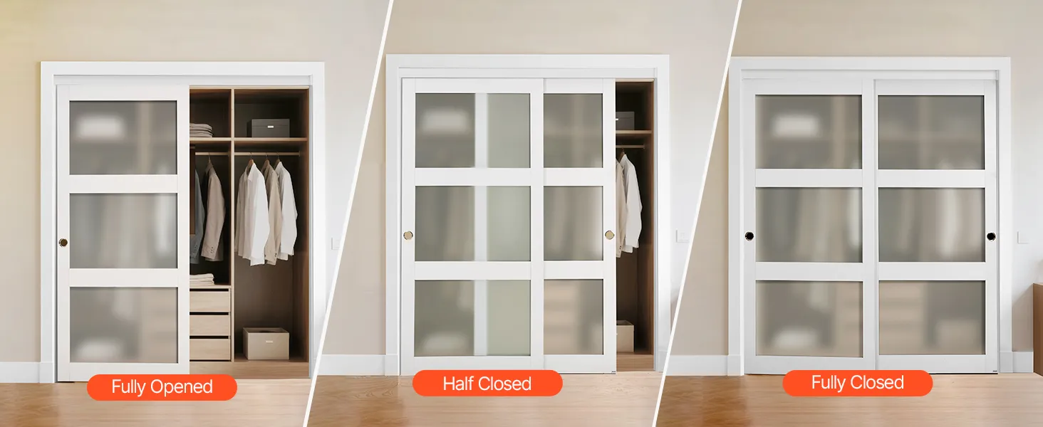 Featuring a durable wood frame, waterproof surface, and 3-Lite frosted tempered glass, our sliding closet doors provide smooth sliding while saving space. Each door panel size: 940 mm (W) x 1986 mm (H), thickness: 22 mm. Fits door openings of 1829 x 2032 mm.