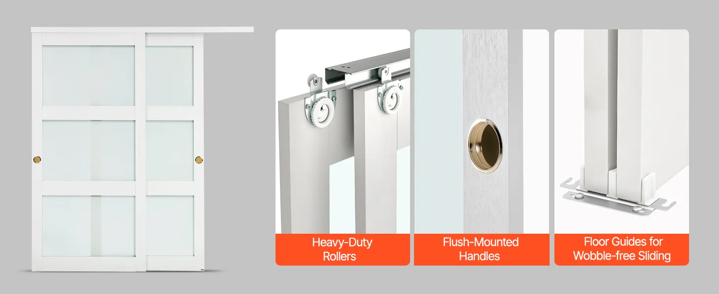 VEVOR Sliding Closet Door, 1829mm (Double 940mm) x 2032 mm, 3-Lite Frosted Glass Bypass Sliding Doors with Hardware Kit, Solid Wood & MDF Slab with Water-Proof PVC Surface for Closets Bedrooms