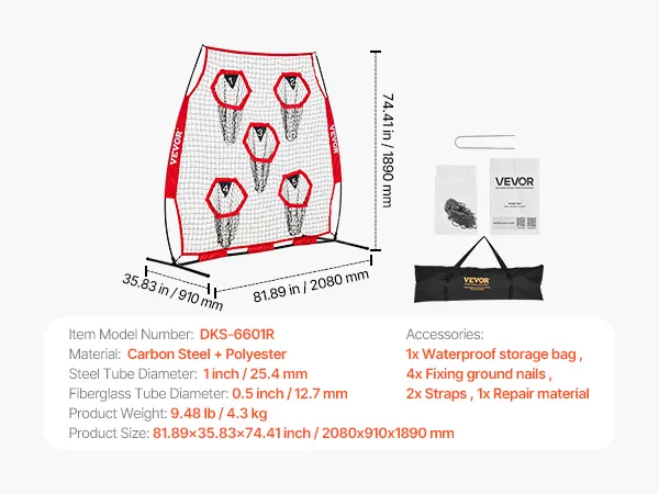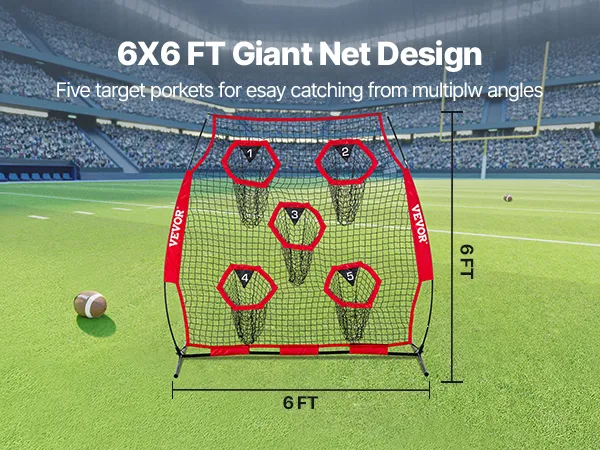 VEVOR 1828.8x1828.8mm Football Trainer Throwing Net, Training Throwing Target Practice Net with 5 Target Pockets, Knotless Net Includes Straps and Portable Carry Case, Improve QB Throwing Accuracy,Red