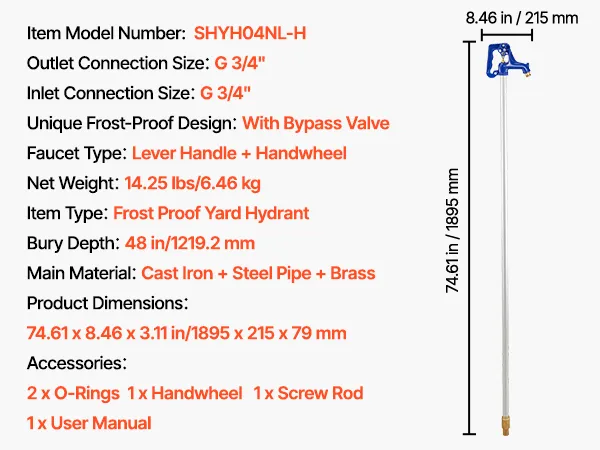 VEVOR Frost Proof Yard Hydrant, 1895mm Freeze-Proof Outdoor Faucet with 1219.2mm Bury Depth, G 3/4" Pipe Connection, Lever Handle + Handwheel, No Lead Freezeless Hydrant for Yard Garden Farm Irrigation