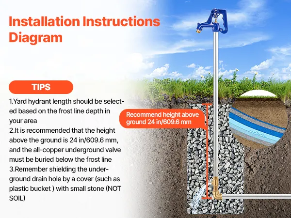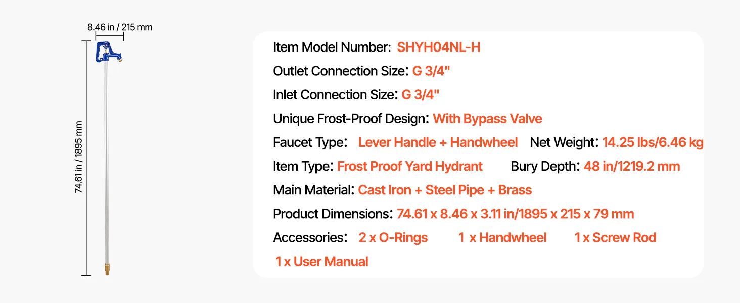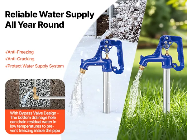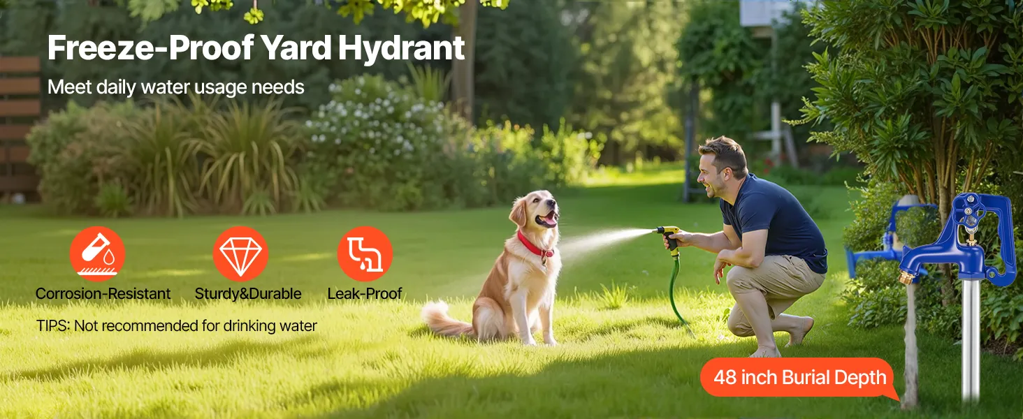 VEVOR frost-proof yard hydrant features a 6.22FT (1895mm) total length, 48-inch bury depth and bypass valve design, keeping water flowing smoothly even in freezing conditions. Durable structure reduces leakage and ensures durability, perfect for watering garden, car cleaning, and farm irrigation.