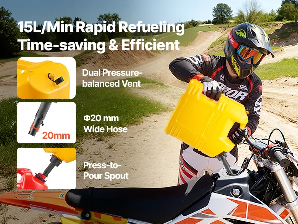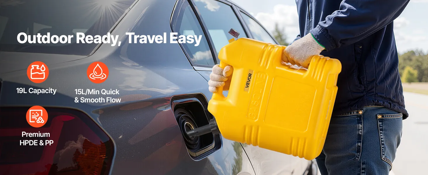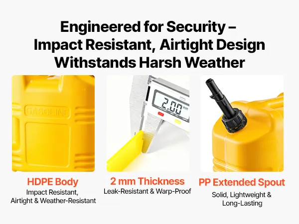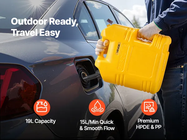 This portable fuel container is made of thick HDPE with 2 mm walls for strength and durability. It features a leak-proof cap and PP spout for smooth 15 L/min pouring. It's ideal for cars, motorcycles, off-road trips, and outdoor use.