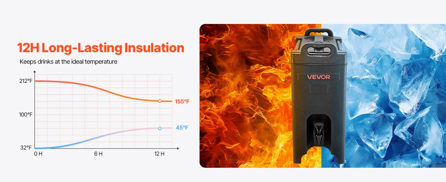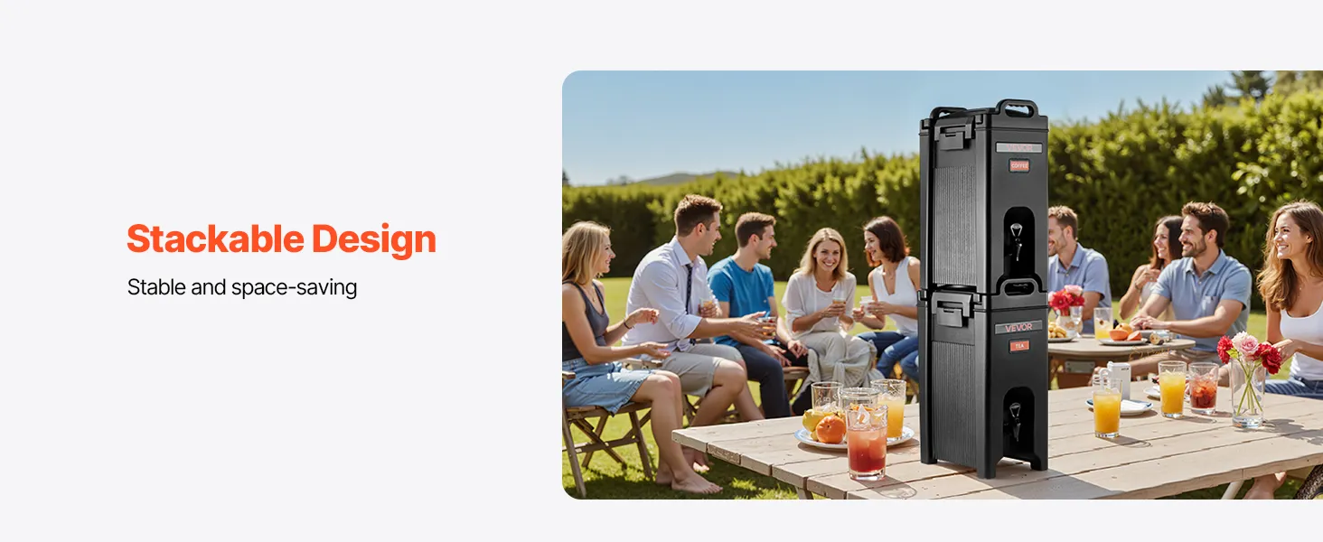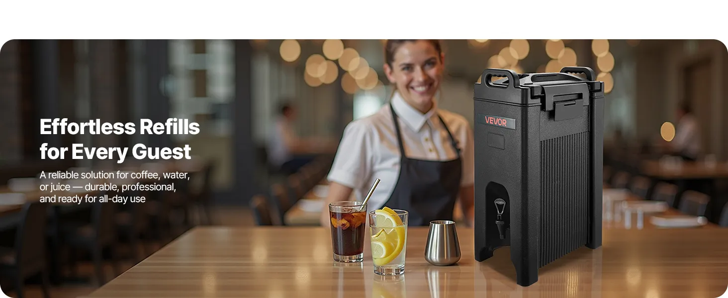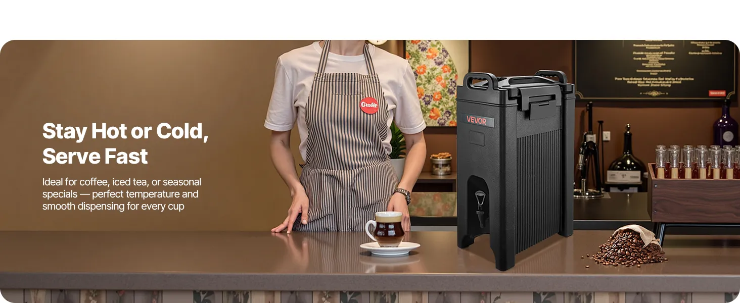 Этот изолированный диспенсер для напитков обладает большой емкостью для непрерывной подачи горячих или холодных напитков, удовлетворяя высокие потребности кофеен, ресторанов, фуршетов, мероприятий на открытом воздухе и многого другого.