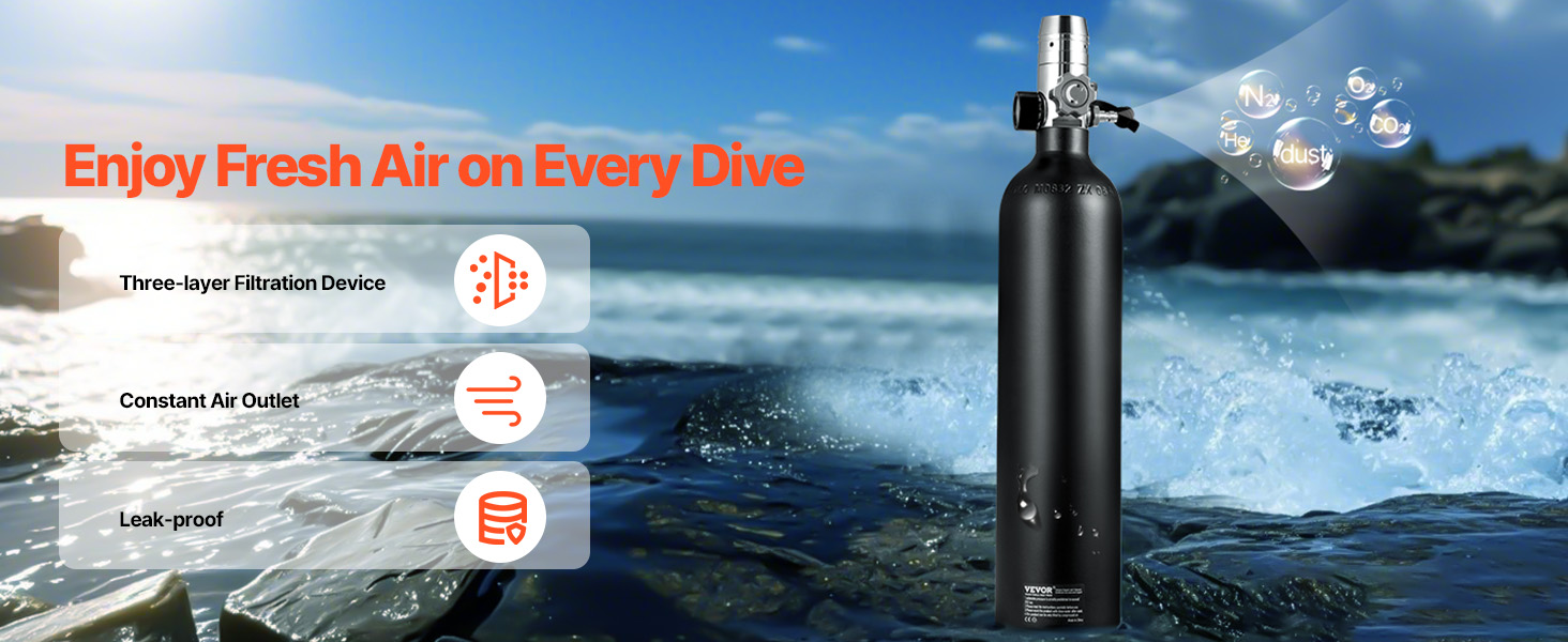 This 1L mini diving tank kit provides 15-20 minutes of dive time, ideal for beginners and recreational divers. It's the great introduction to the world beneath the waves!